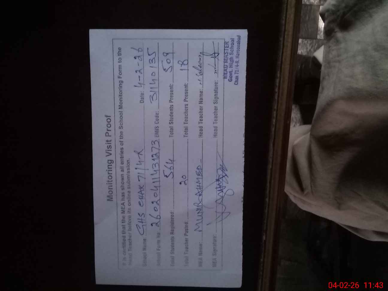 | Attendance Register | Head Teacher | MEA with School | Visit Proof |