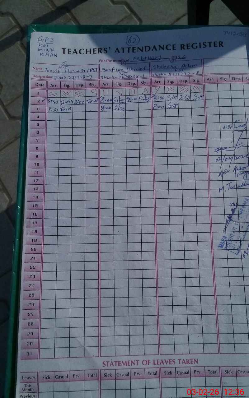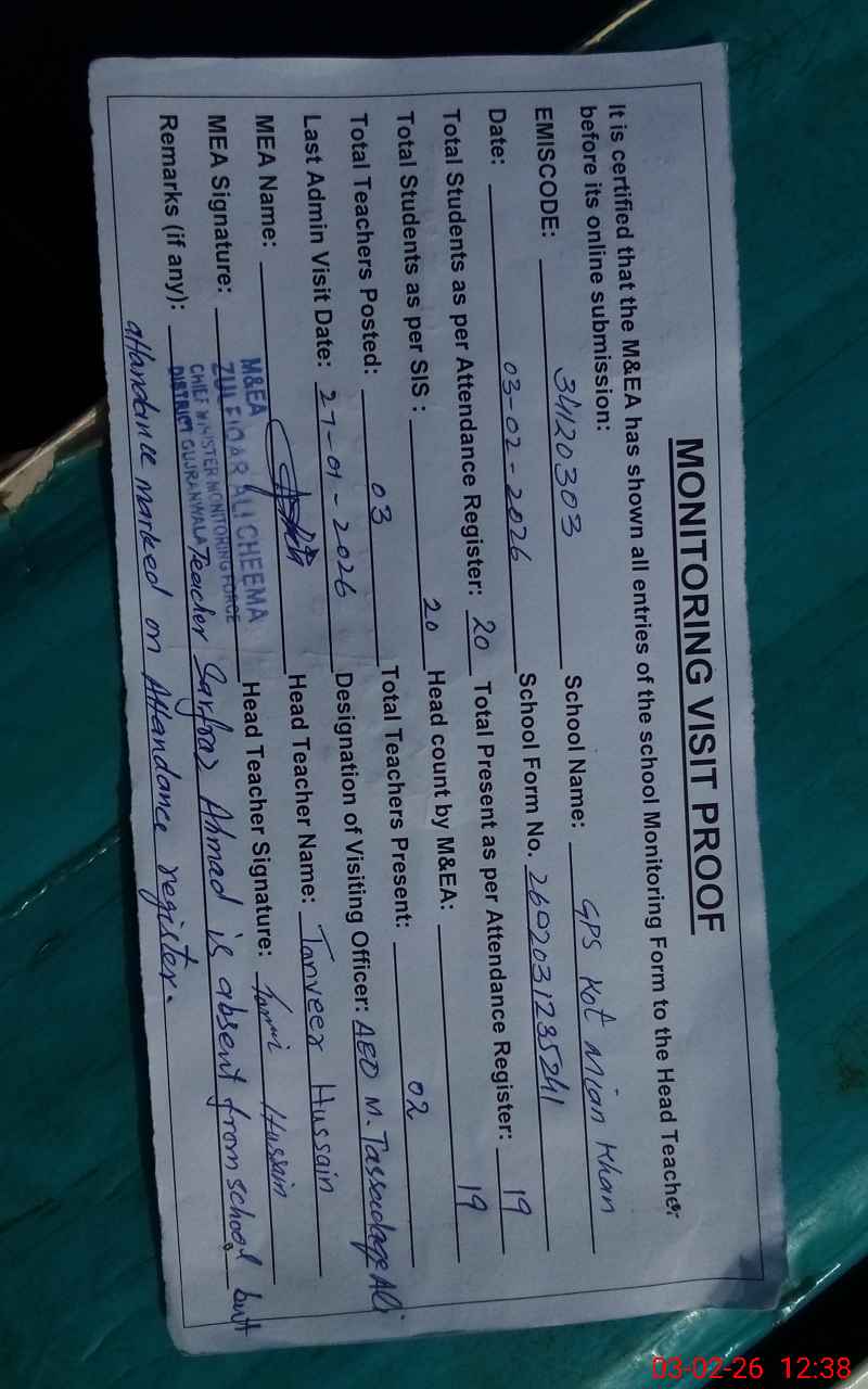 | EMIS Code: 34120303 | Name of School: GPS KOT MIAN KHAN | |||
