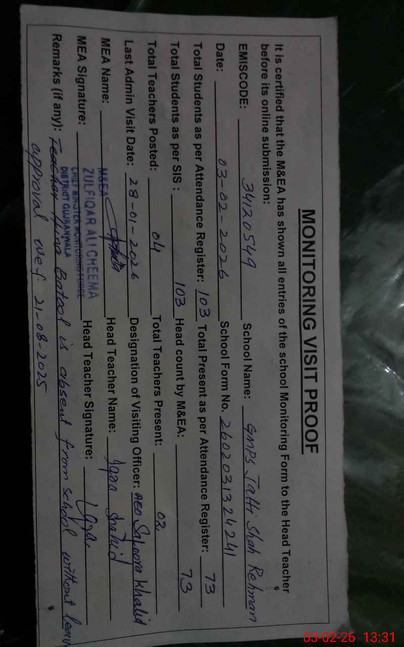 | EMIS Code: 34120549 | Name of School: GMPS JATTI SHAH REHMAN | |||