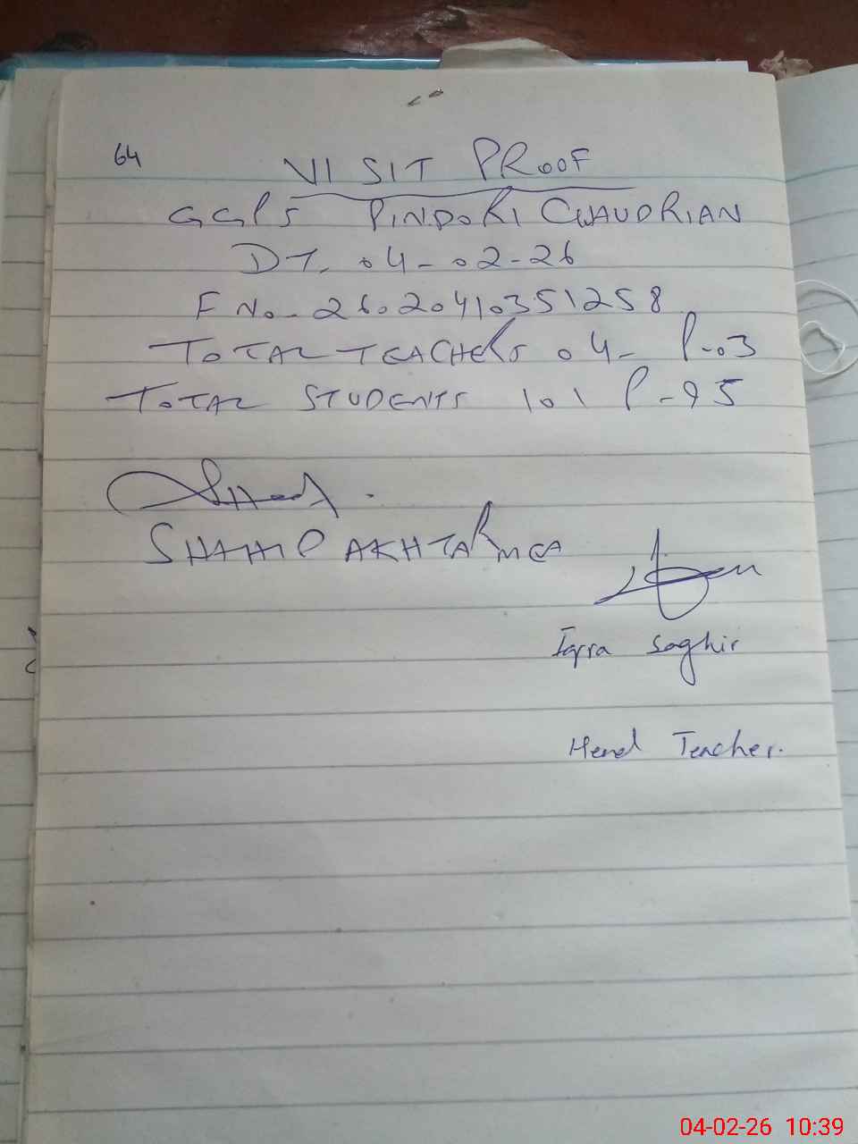 | Attendance Register | Head Teacher | MEA with School | Visit Proof |