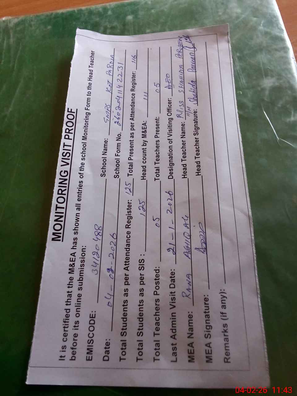 | Attendance Register | Head Teacher | MEA with School | Visit Proof |