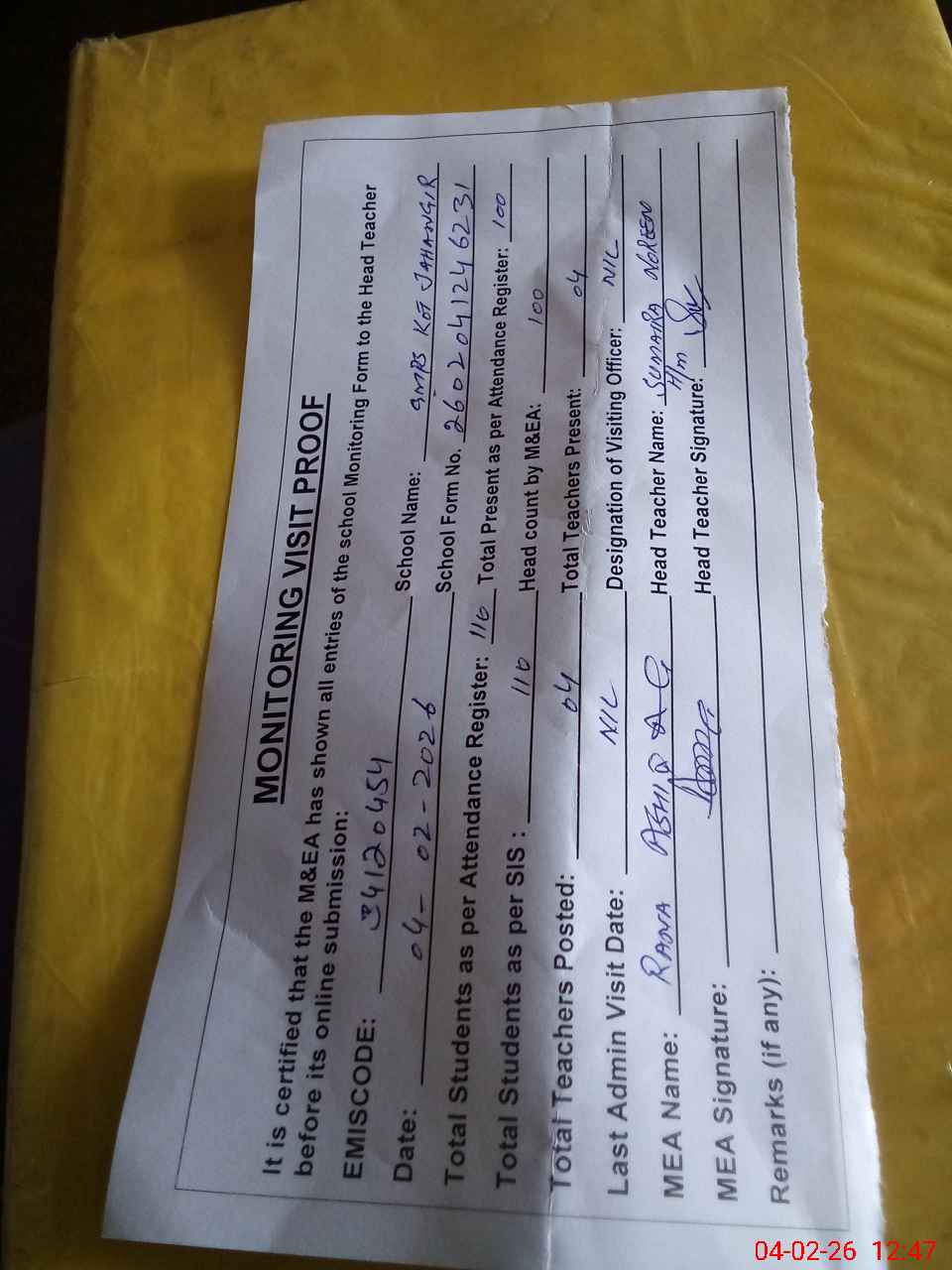 | Attendance Register | Head Teacher | MEA with School | Visit Proof |