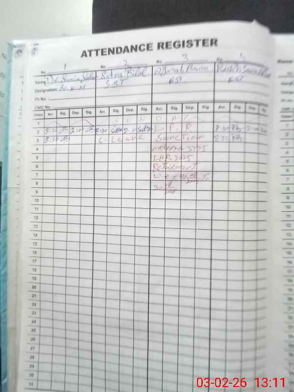 | CNIC | Full Name | Designation | R/C | Absence During Last Calender Month |