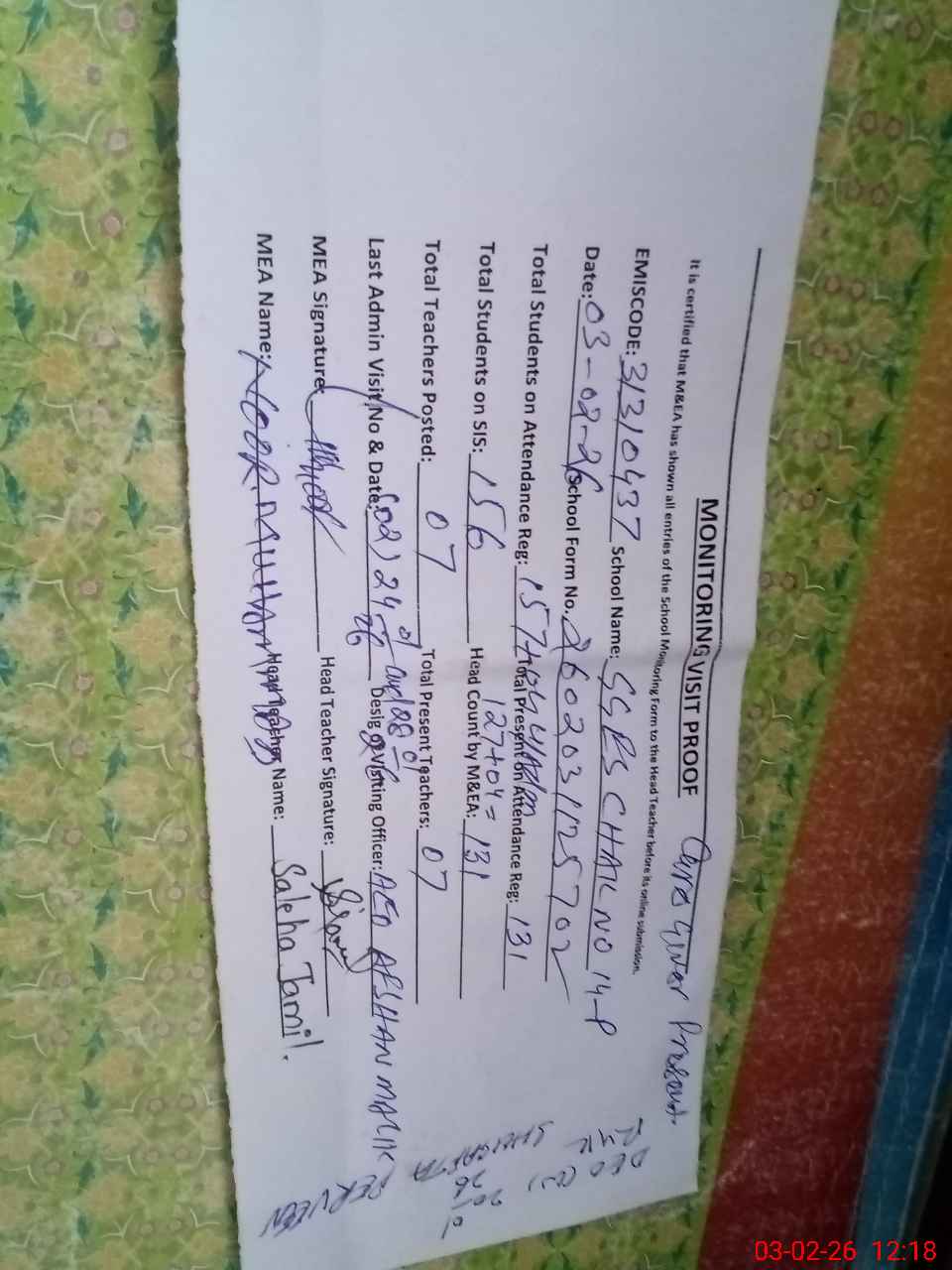 | Attendance Register | Head Teacher | MEA with School | Visit Proof |