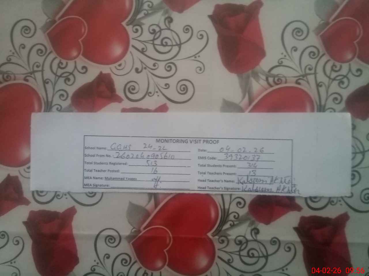 | Attendance Register | Head Teacher | MEA with School | Visit Proof |