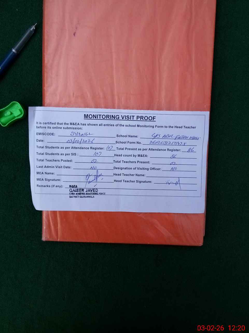 | Attendance Register | Head Teacher | MEA with School | Visit Proof |