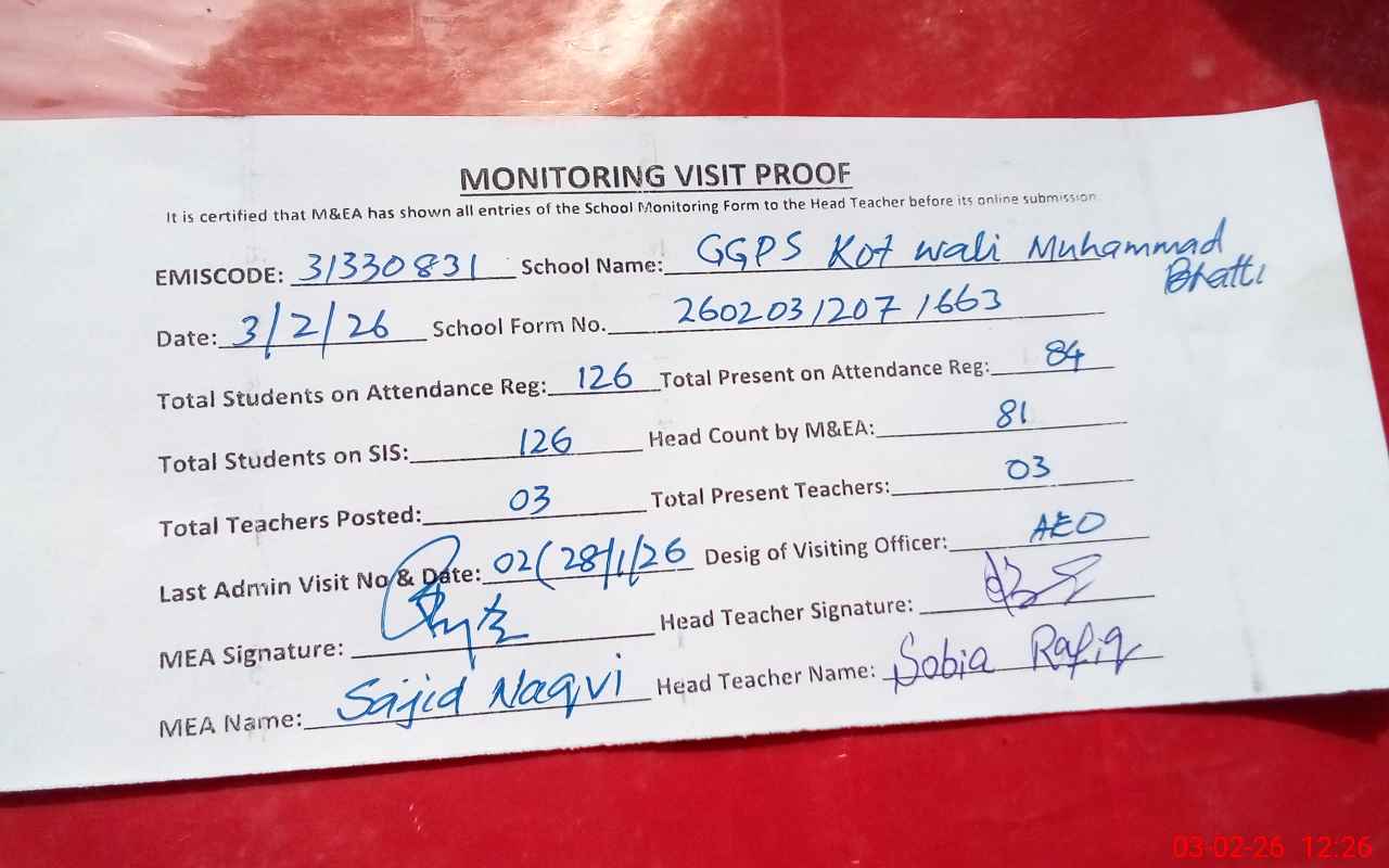 | EMIS Code: 31330831 | Name of School: GGPS KOT WALI MUHAMMAD BHATTI | |||
