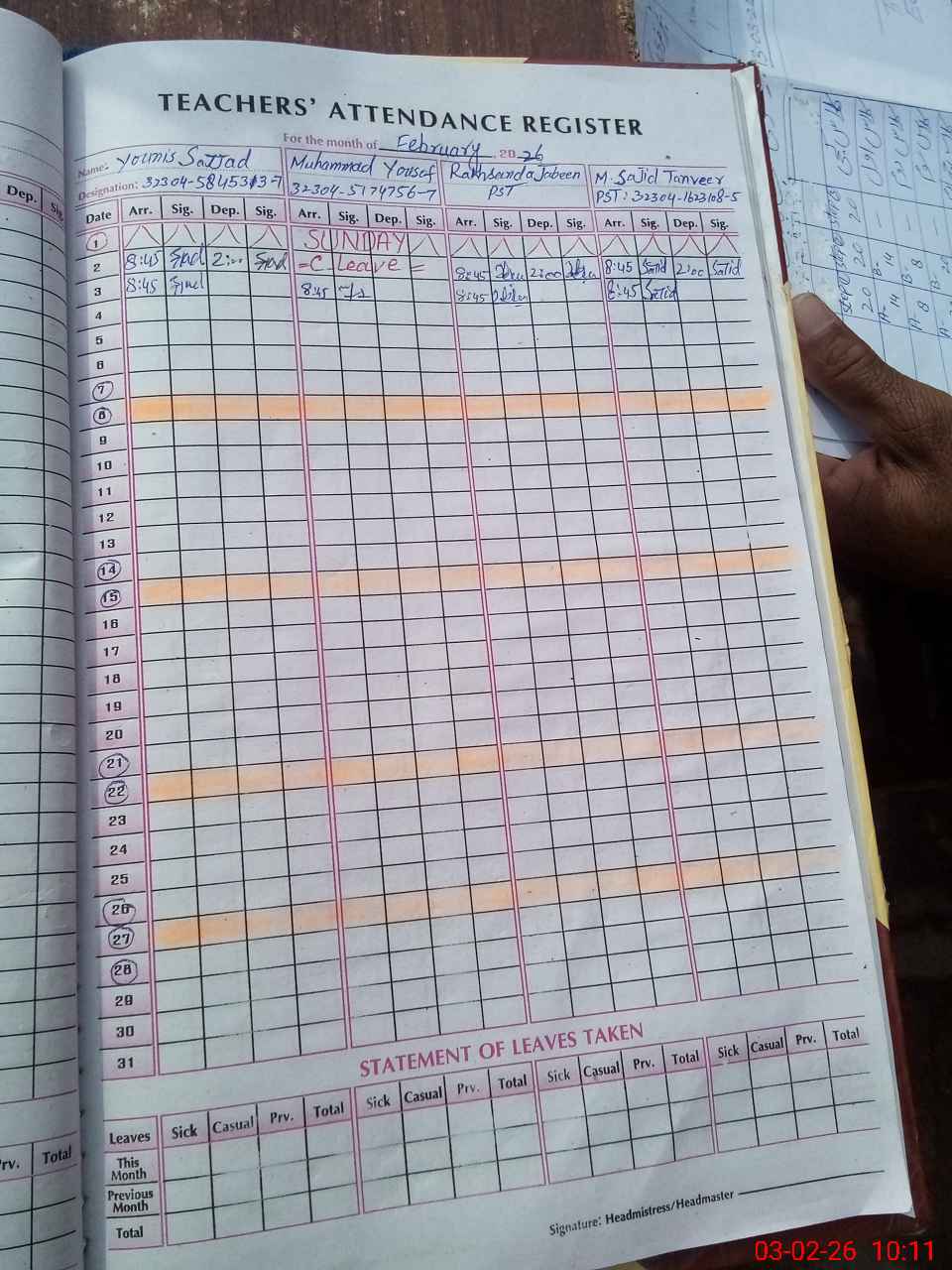 | Name: SA**** HU**** Designation: (School Headmaster's/Headmistress's) PST Phone/Cell Number: 03**** |