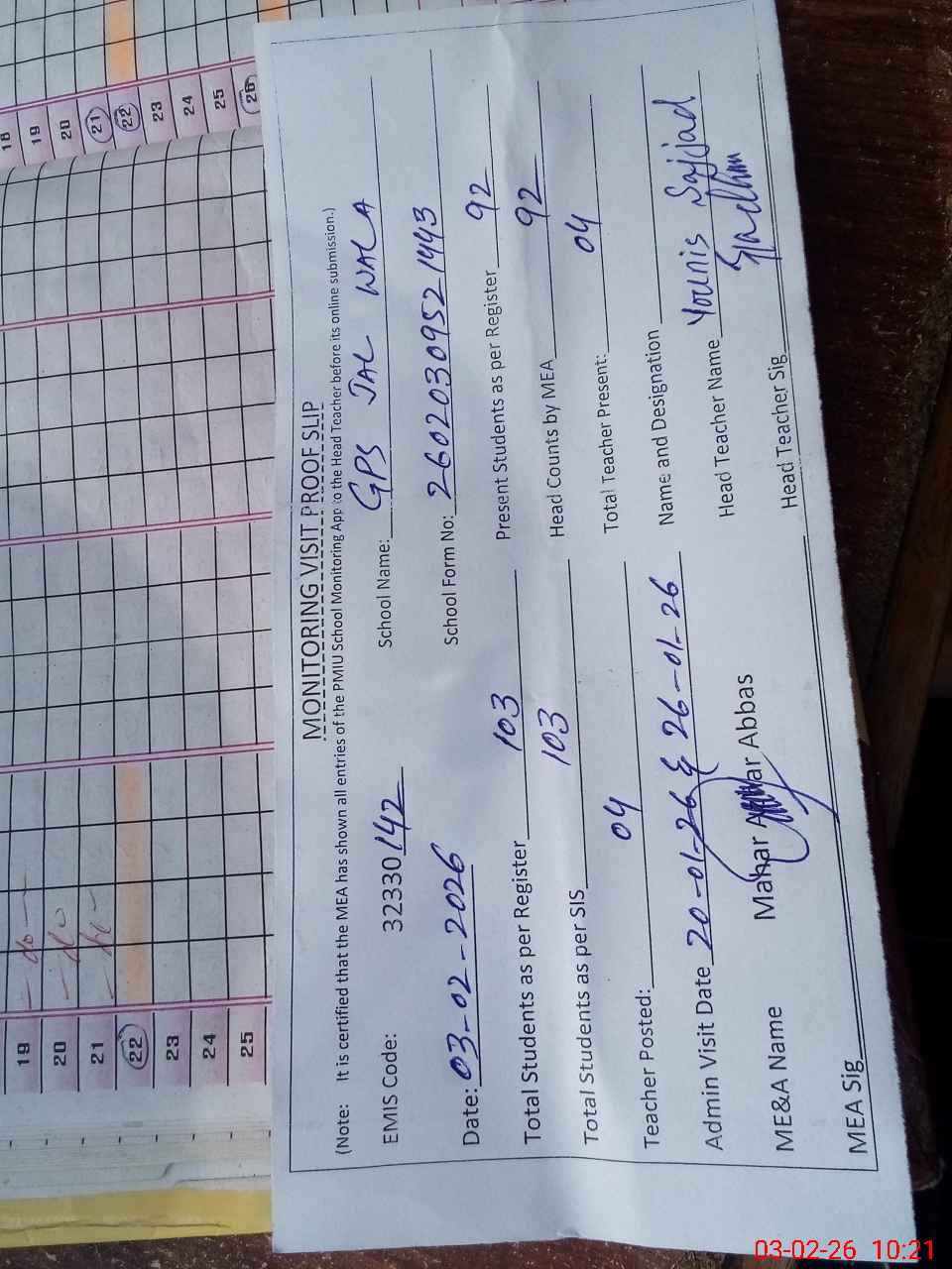 | Attendance Register | Head Teacher | MEA with School | Visit Proof |