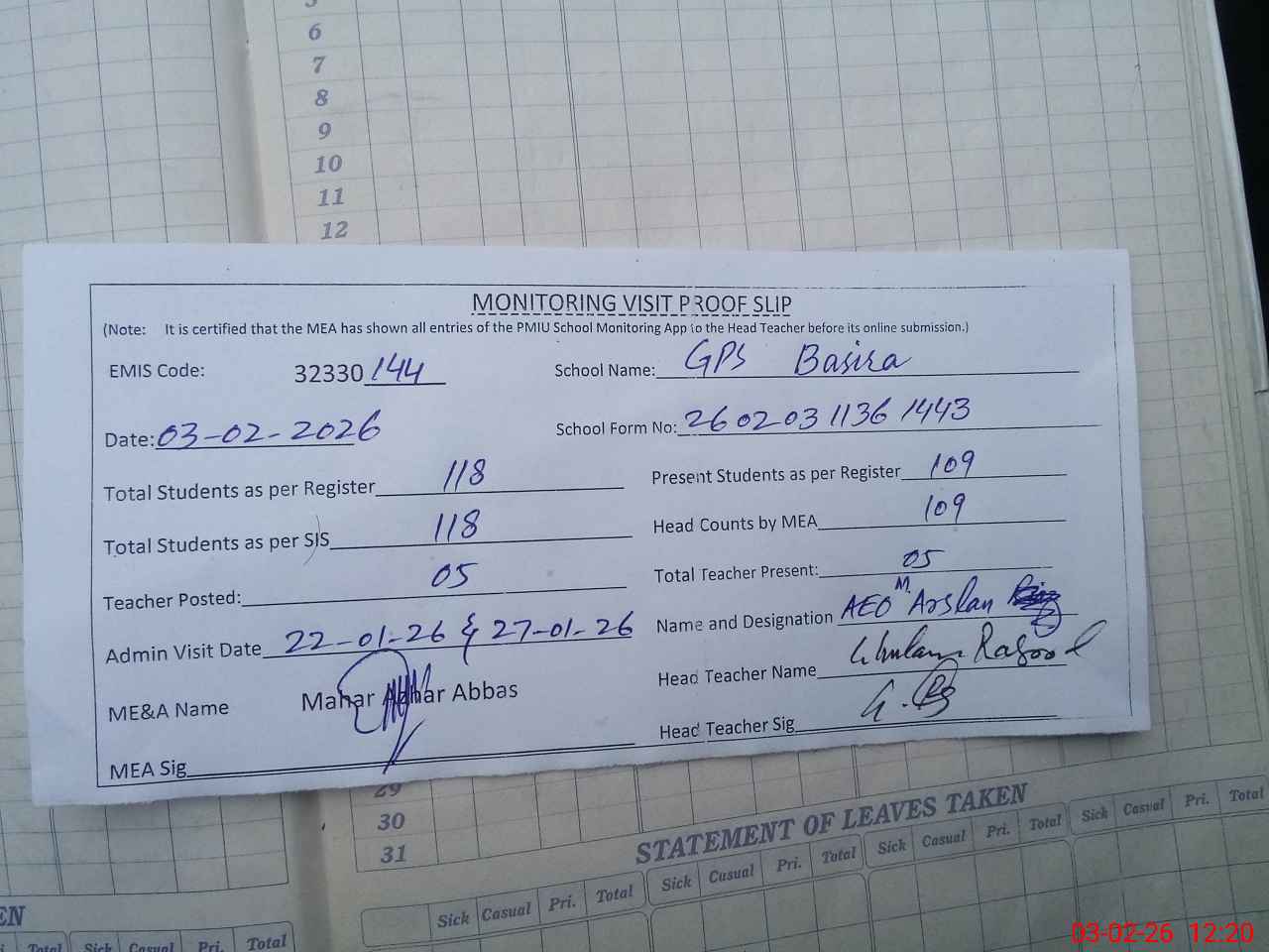 | EMIS Code: 32330144 | Name of School: GPS BASIRA | |||