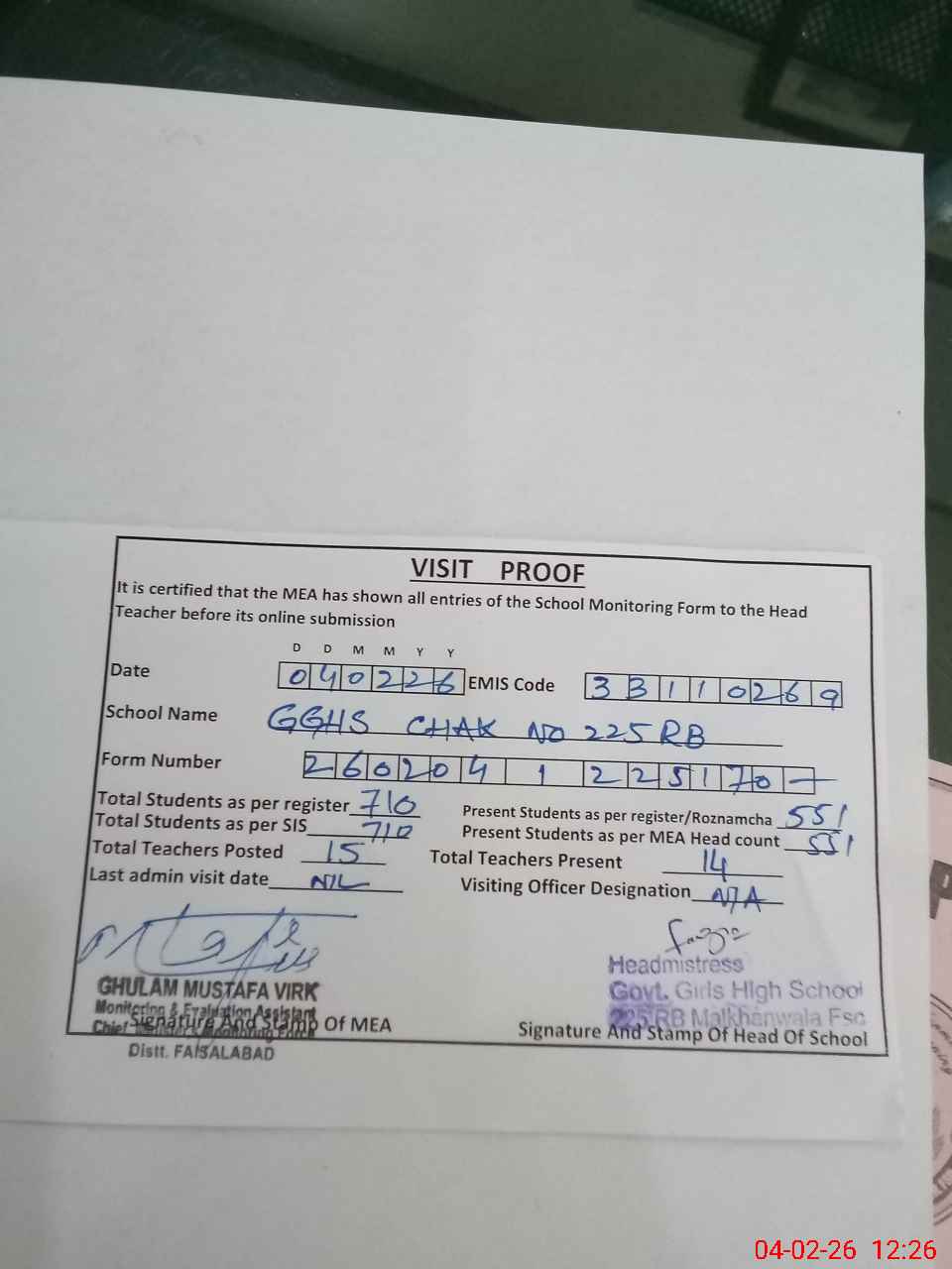 | EMIS Code: 33110269 | Name of School: GGHS CHAK NO 225 RB | |||