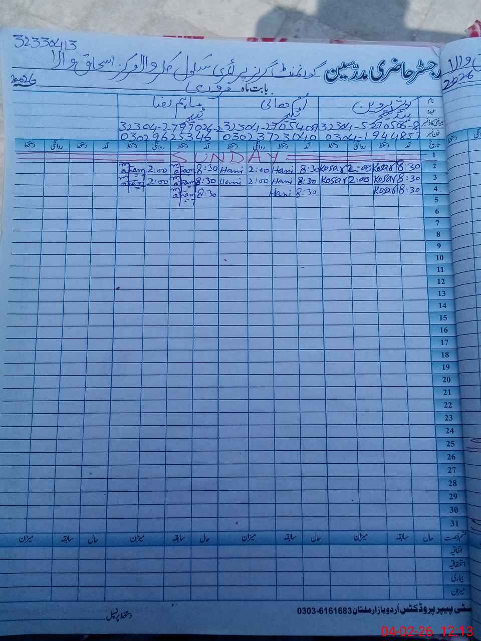 | CNIC | Full Name | Designation | R/C | Absence During Last Calender Month |