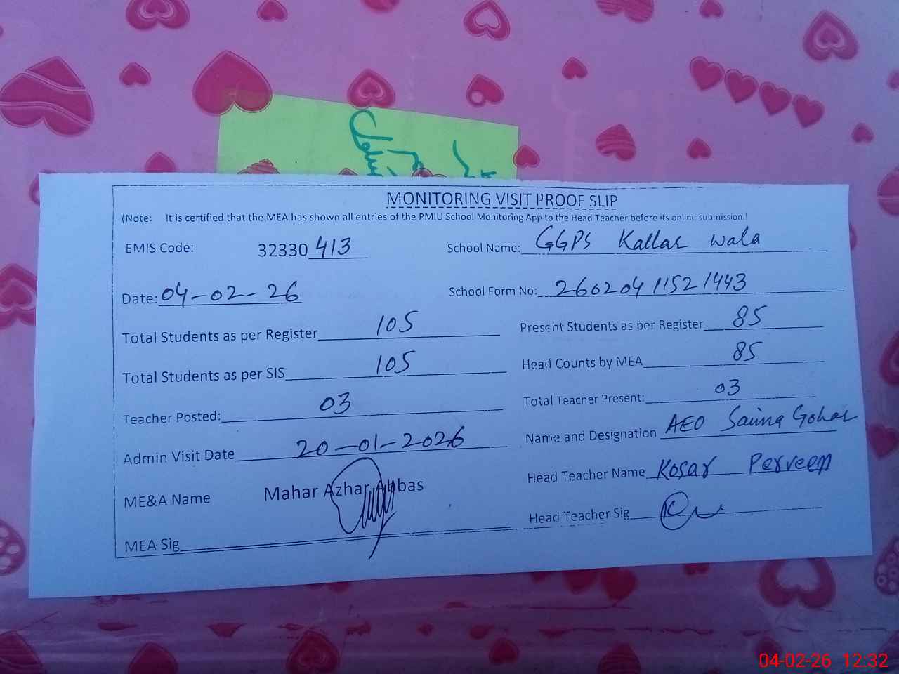 | Attendance Register | Head Teacher | MEA with School | Visit Proof |