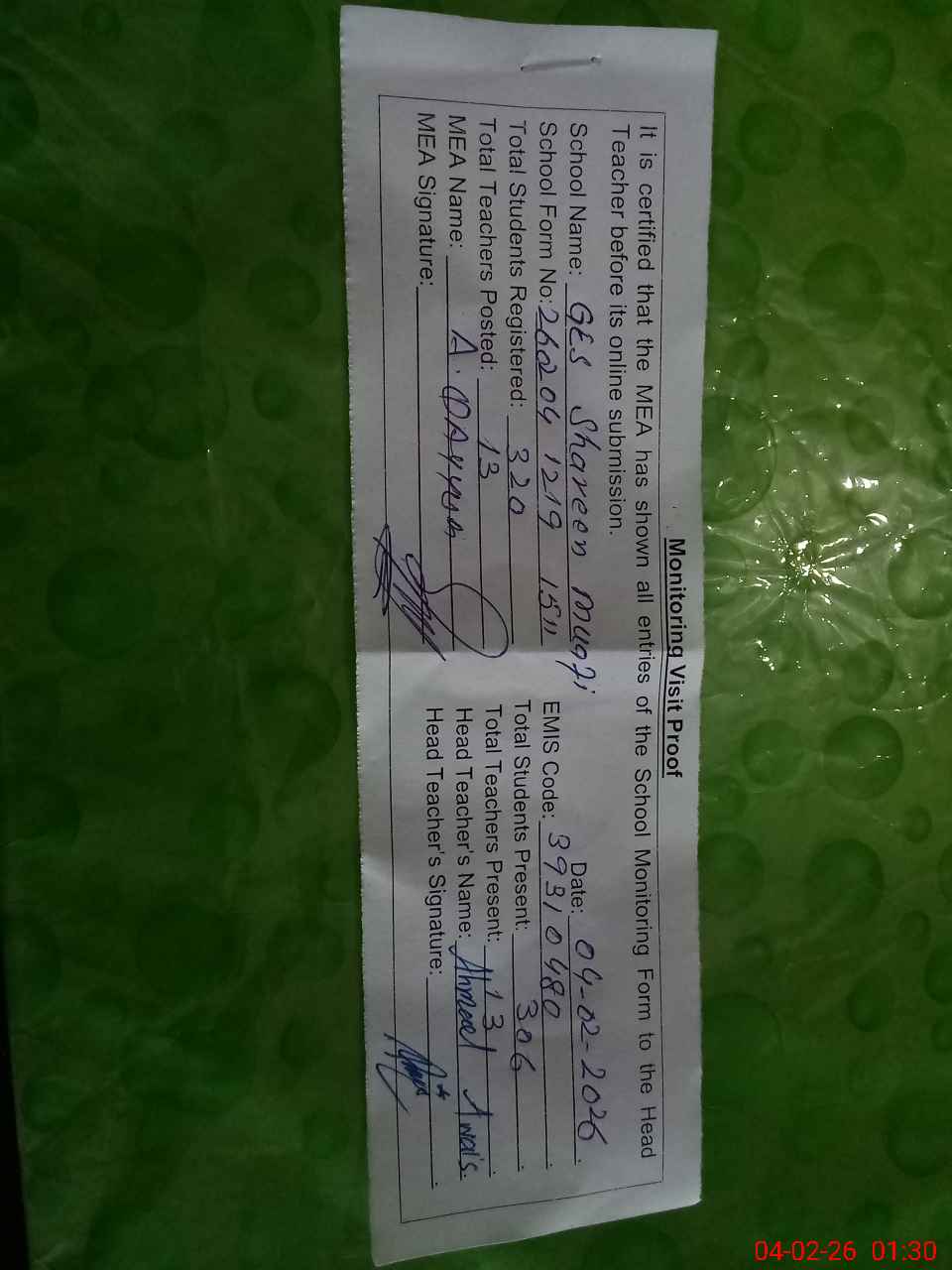 | Attendance Register | Head Teacher | MEA with School | Visit Proof |