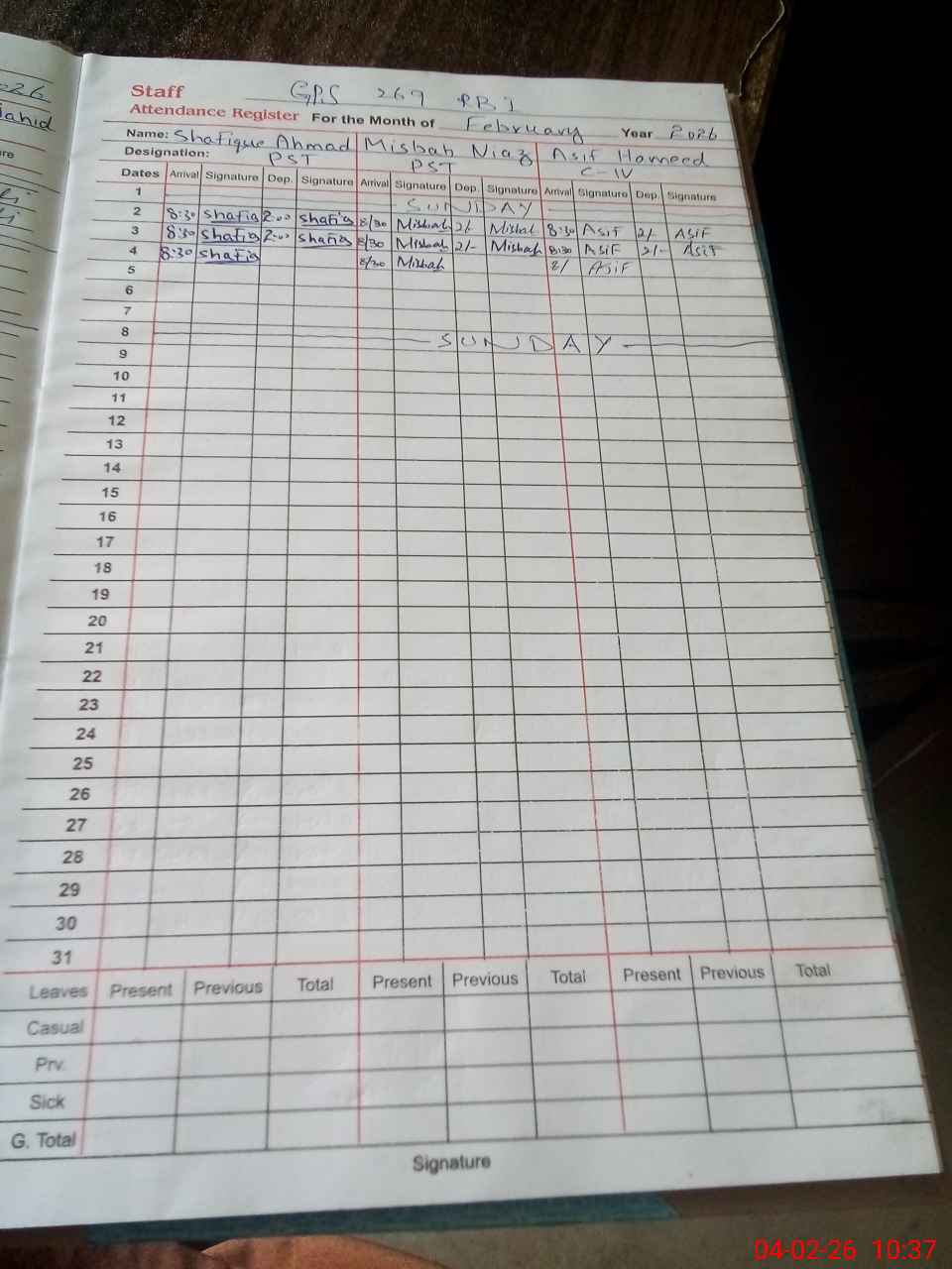 | Remarks (Use Separate Page if Required): PST ZULFIQAR marked leave on register but not shown any proof of on line Cleave | |||||