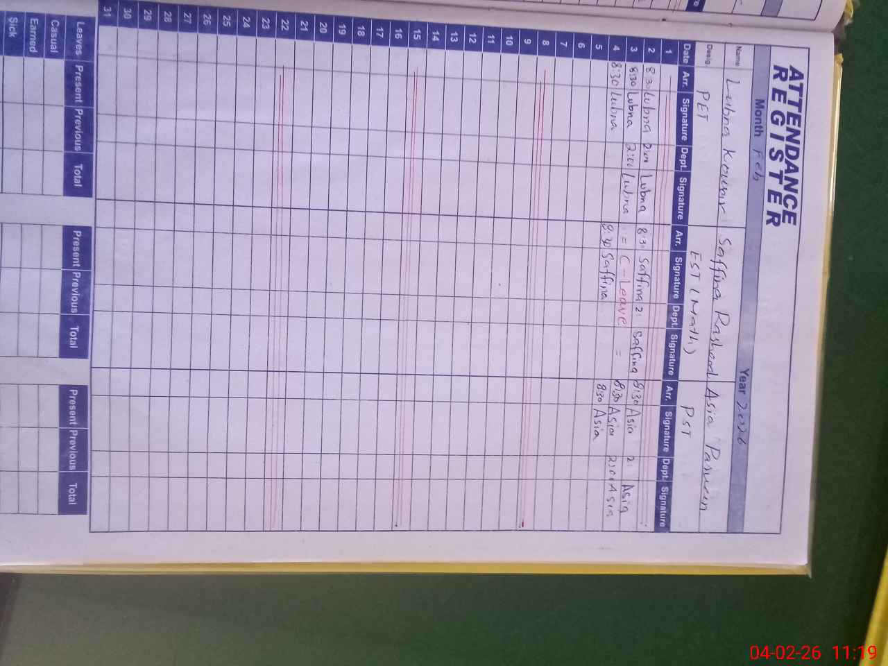 | Leave | Duty | Absent | Maternity | Medical | Ex- Pak |