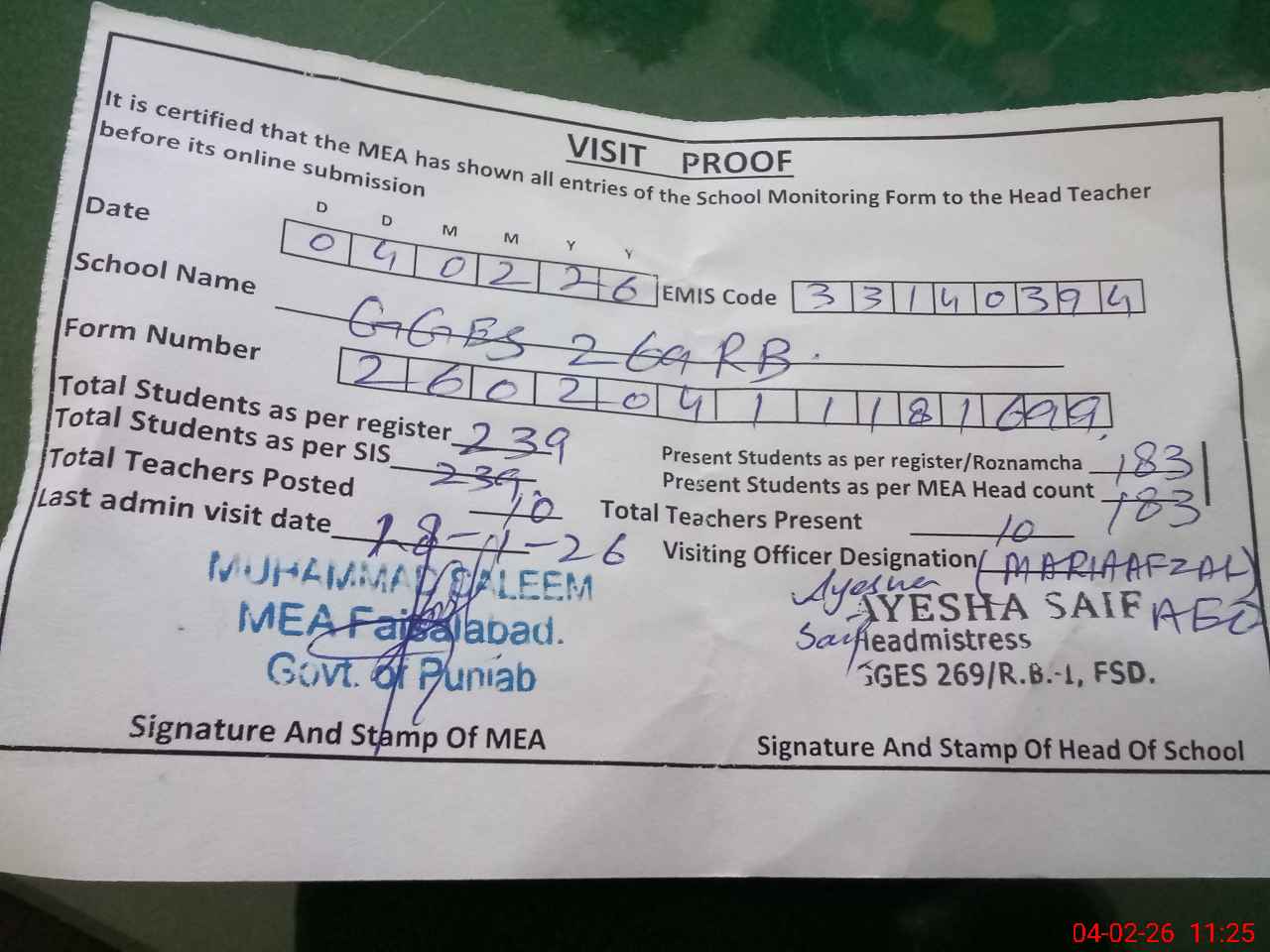 | Attendance Register | Head Teacher | MEA with School | Visit Proof |