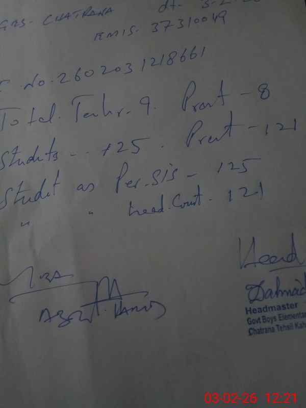 | Total no. of Classrooms: 3 No. of Classrooms Used for Teaching: 3 No. of Classrooms Storing Old Furniture, FTBs, etc: 0Comments if Any: 0 |