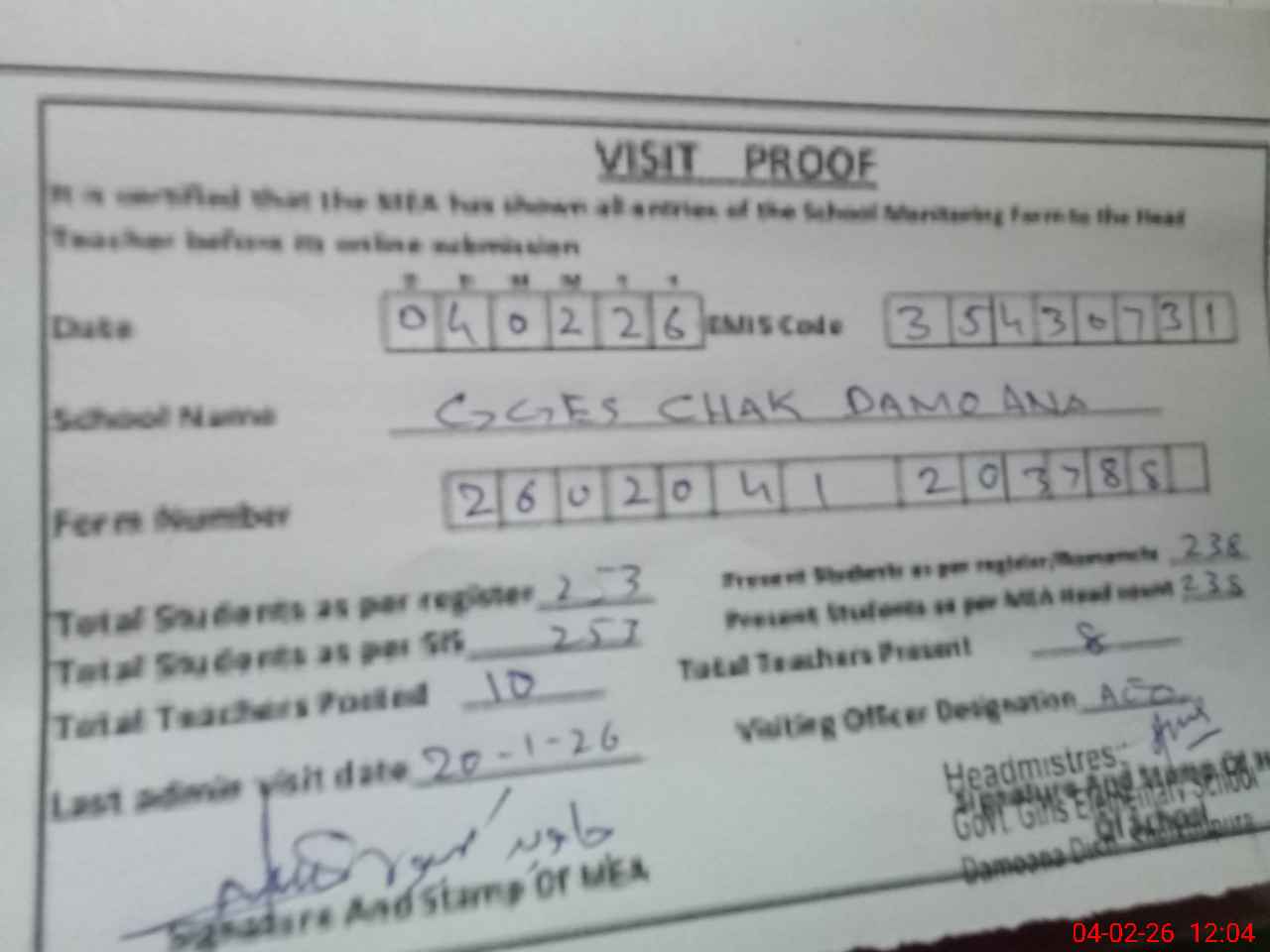 | Attendance Register | Head Teacher | MEA with School | Visit Proof |