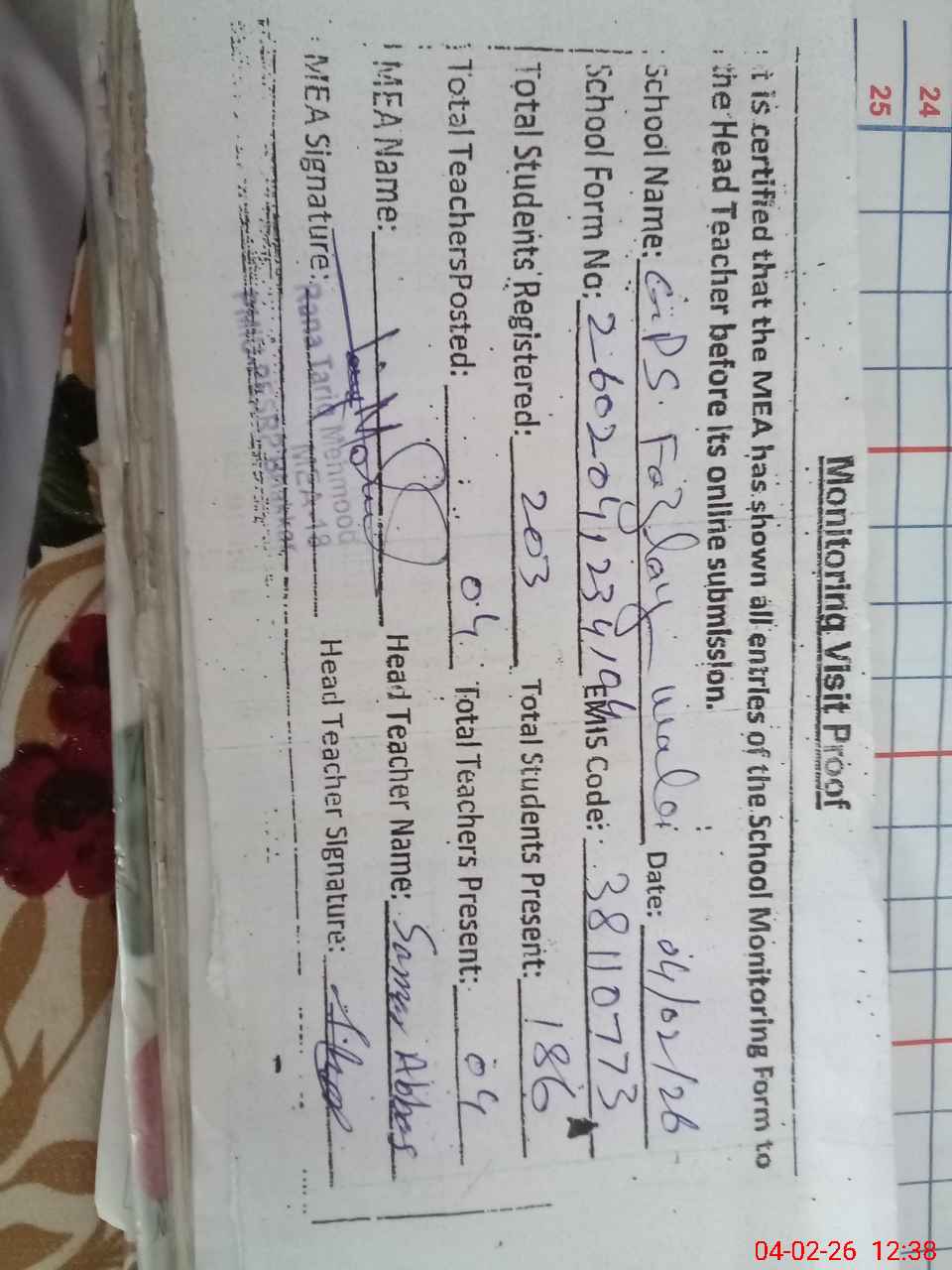 | Attendance Register | Head Teacher | MEA with School | Visit Proof |