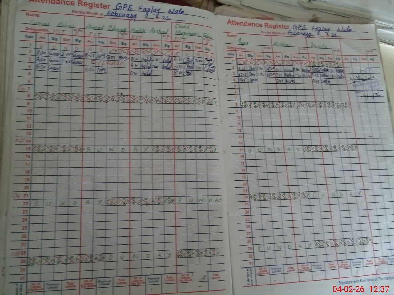 | CNIC | Full Name | Designation | R/C | Absence During Last Calender Month |