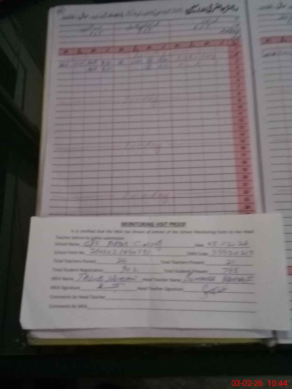 | Attendance Register | Head Teacher | MEA with School | Visit Proof |