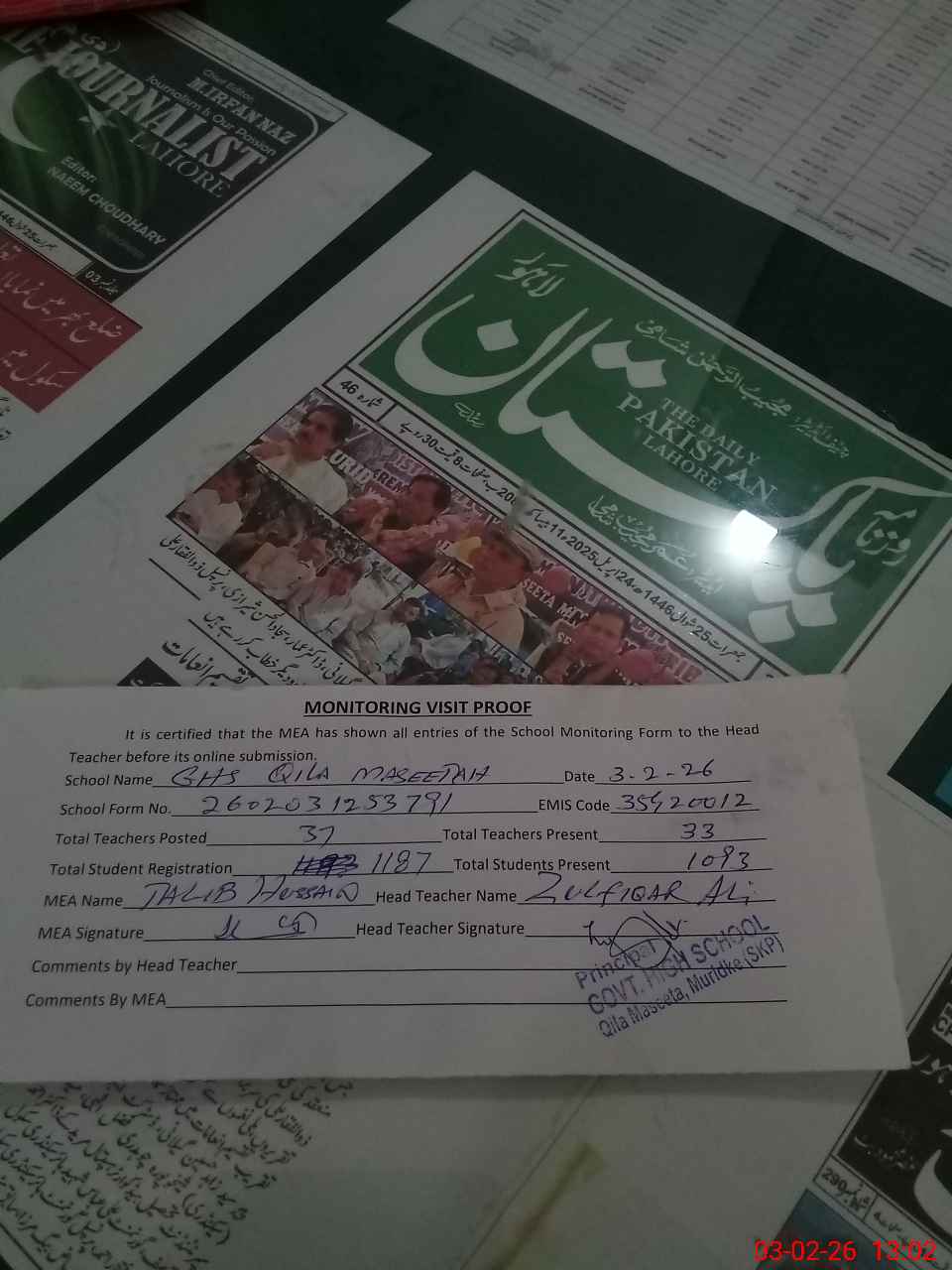 | EMIS Code: 35420012 | Name of School: GHS QILA MASSETAH MURIDKE | |||