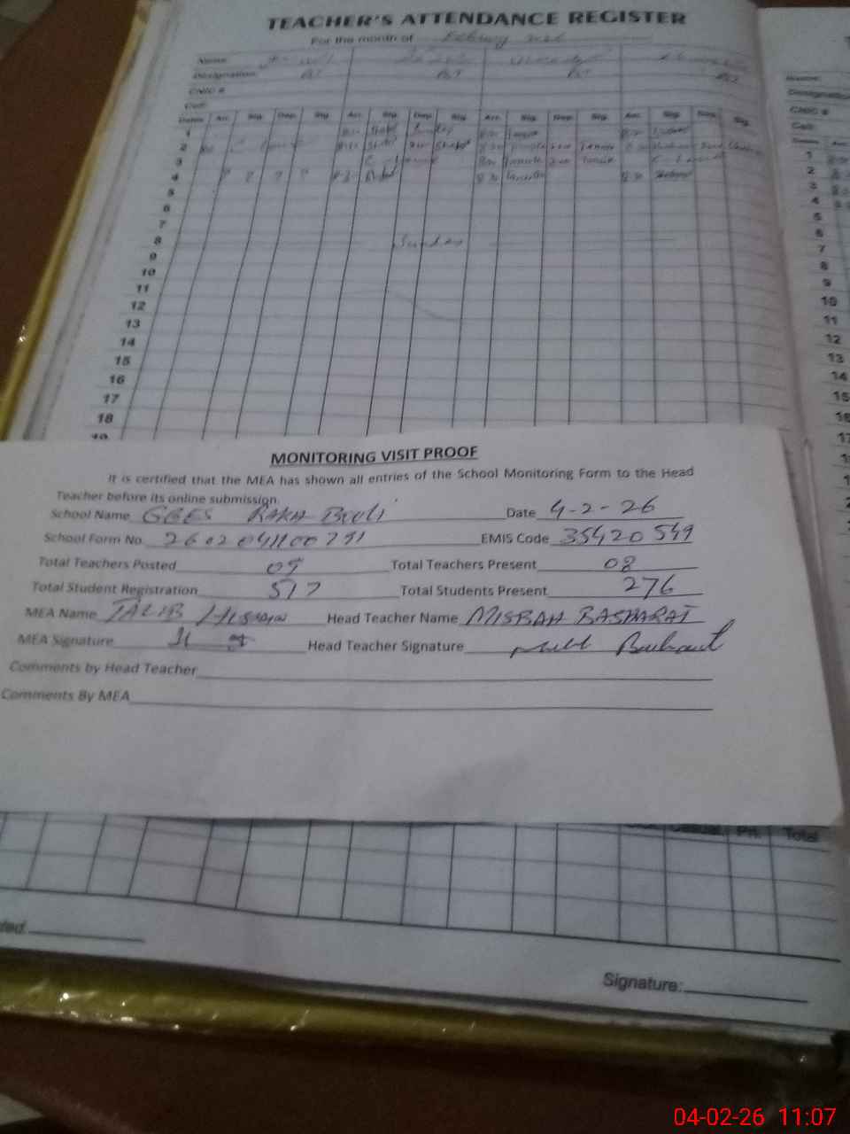 | Attendance Register | Head Teacher | MEA with School | Visit Proof |