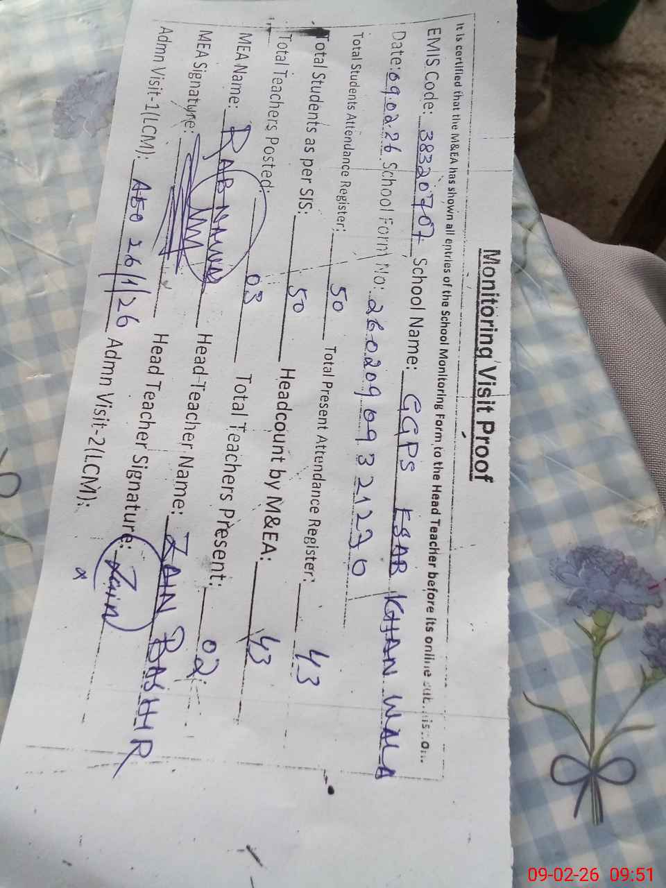 | Attendance Register | Head Teacher | MEA with School | Visit Proof |