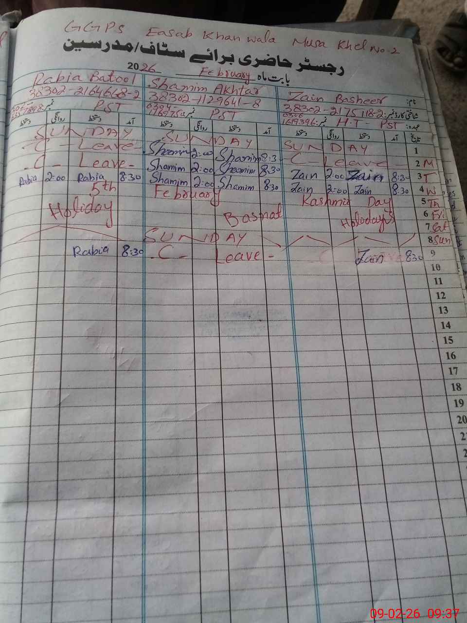 | Name: Za**** Ba**** Designation: (School Headmaster's/Headmistress's) PST Phone/Cell Number: 03**** |