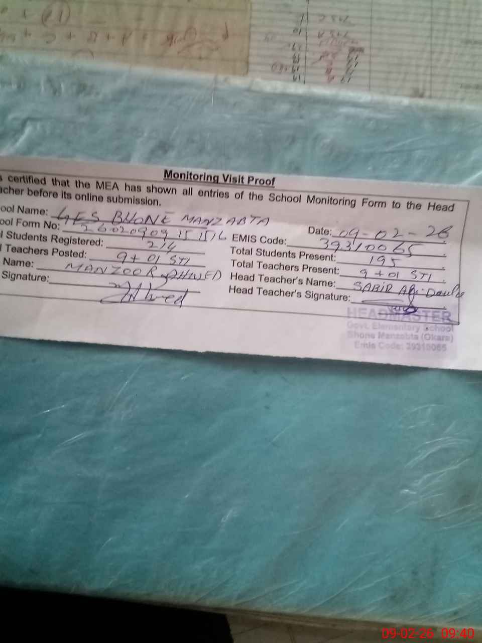 | Attendance Register | Head Teacher | MEA with School | Visit Proof |