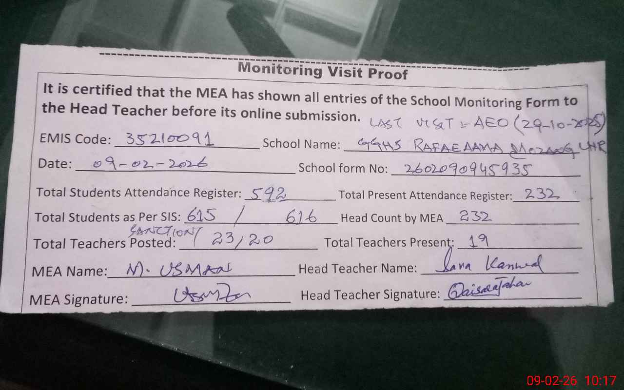 | EMIS Code: 35210091 | Name of School: GGHS RAFA-E-AAMA MOZANG LHR | |||