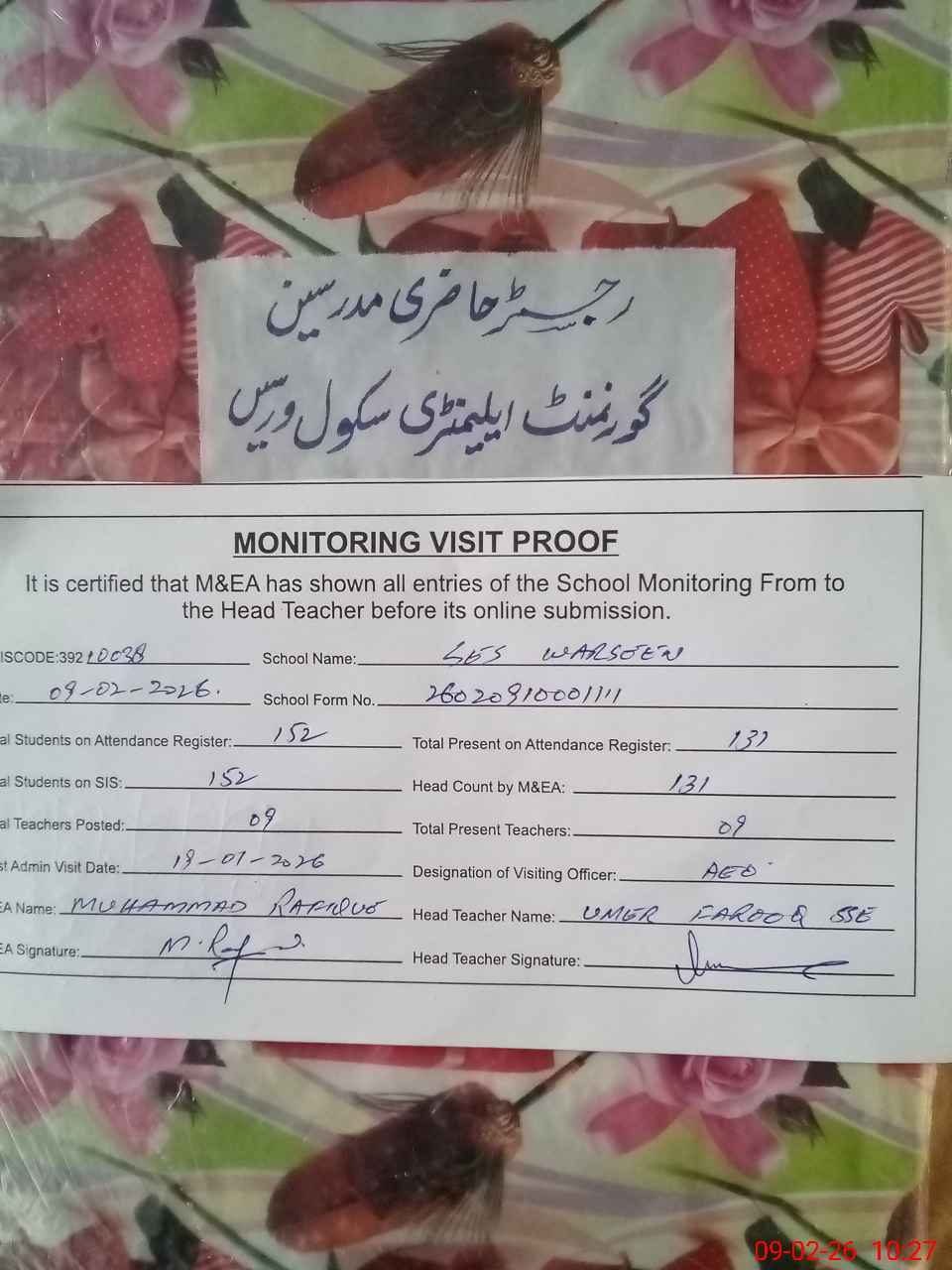| Attendance Register | Head Teacher | MEA with School | Visit Proof |