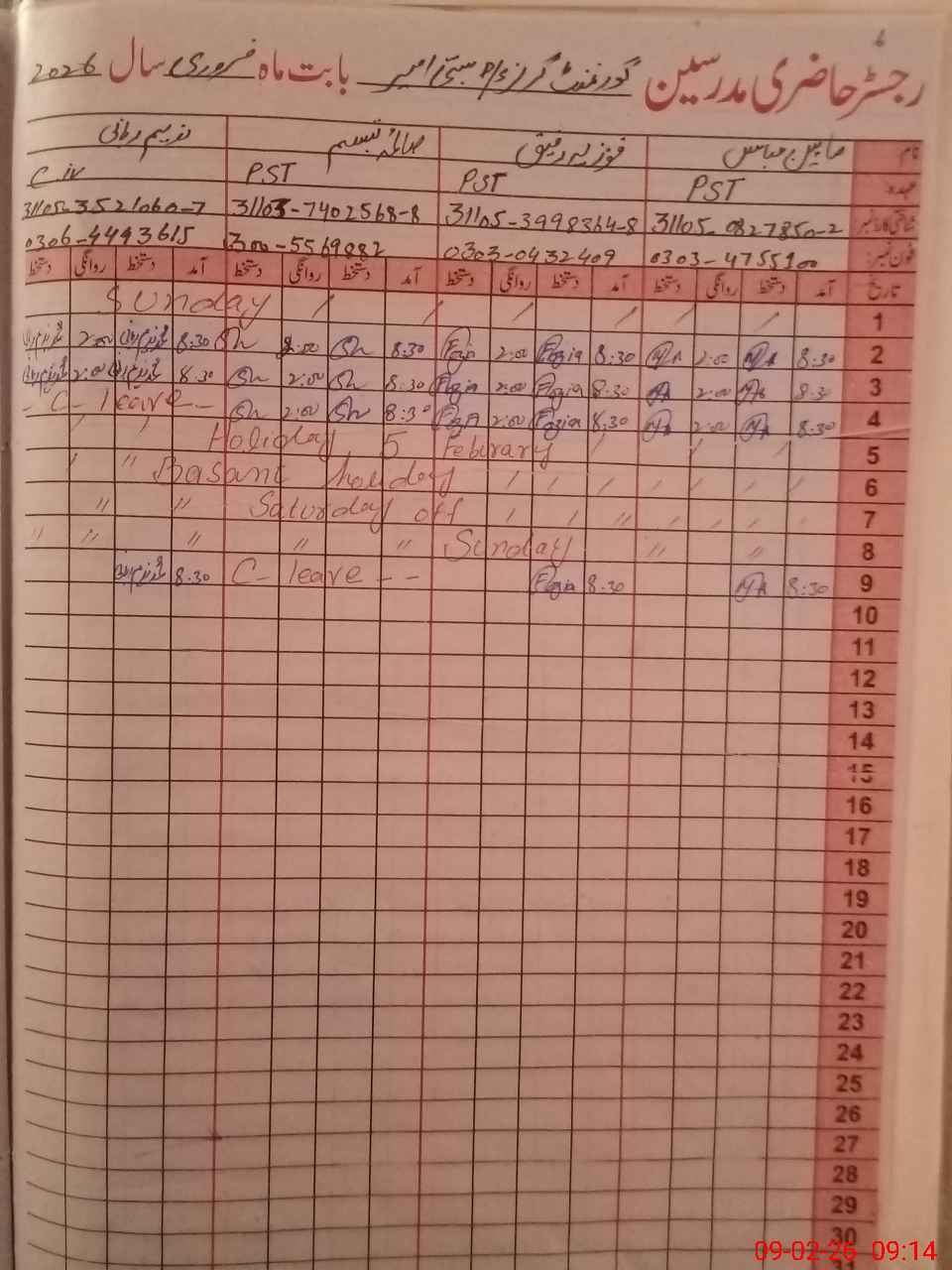 | CNIC | Full Name | Designation | R/C | Absence During Last Calender Month |
