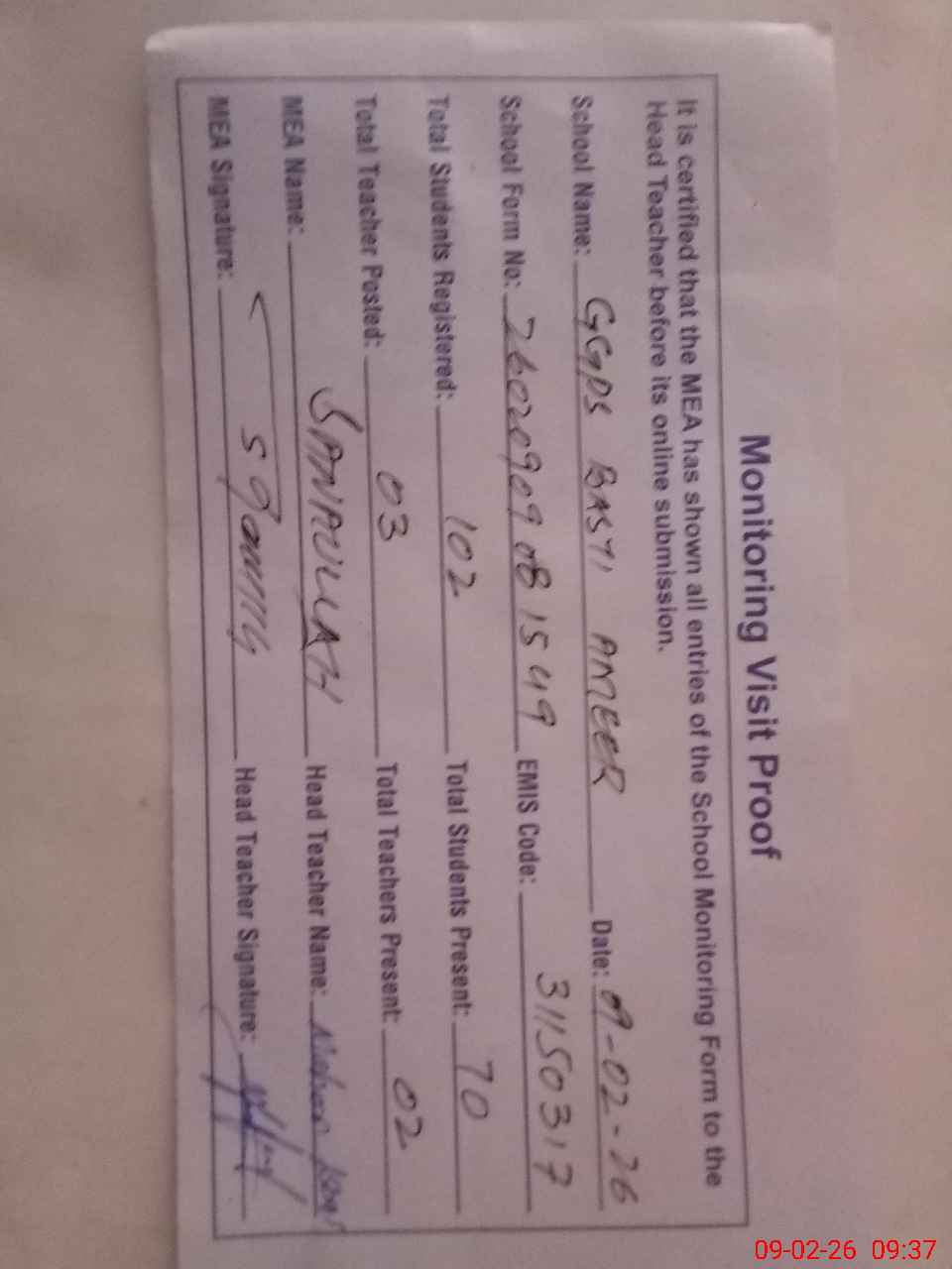 | Attendance Register | Head Teacher | MEA with School | Visit Proof |