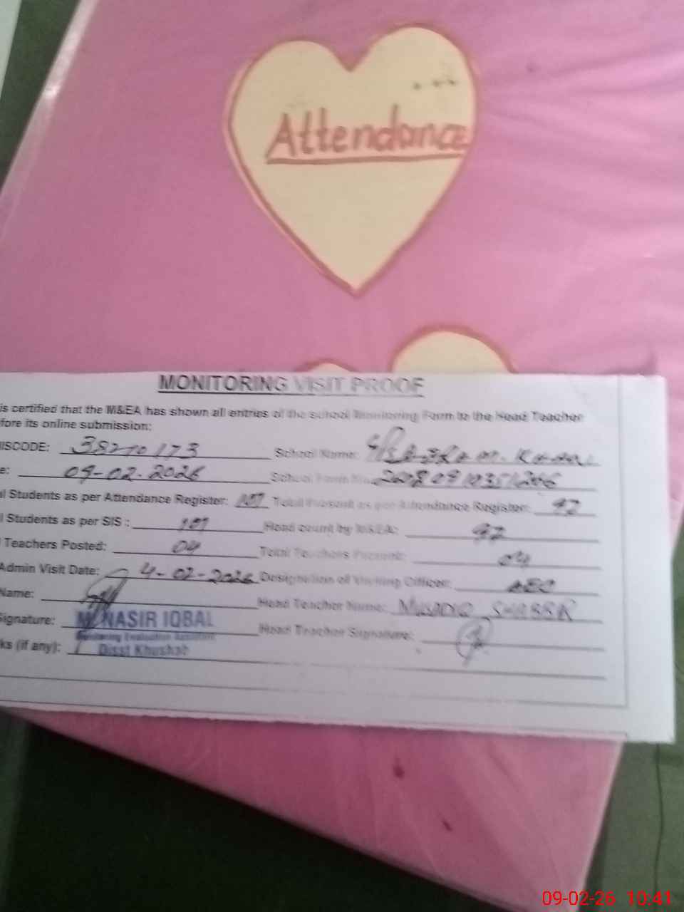 | Attendance Register | Head Teacher | MEA with School | Visit Proof |