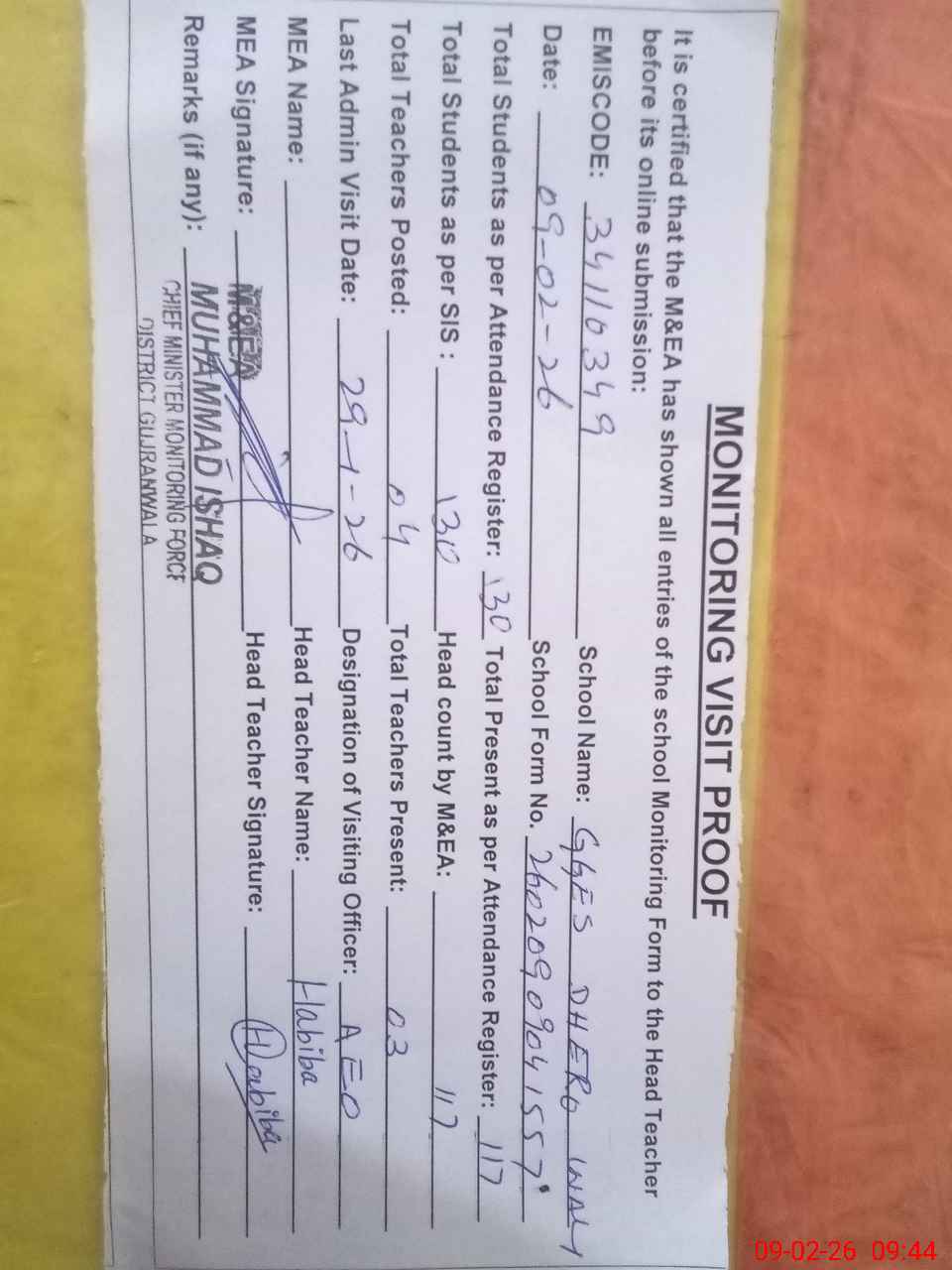 | Attendance Register | Head Teacher | MEA with School | Visit Proof |