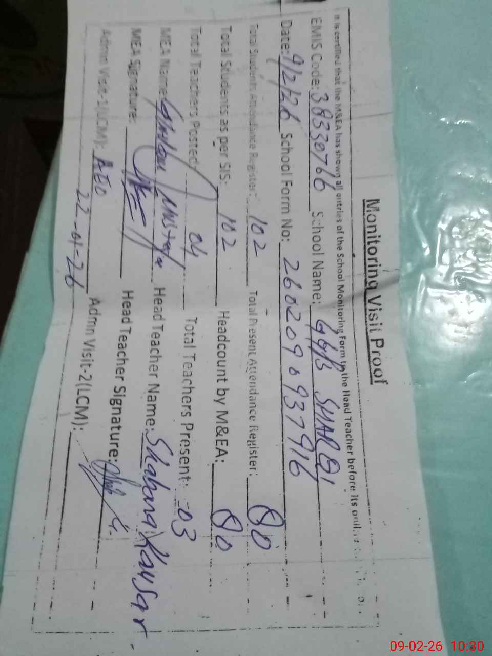 | Attendance Register | Head Teacher | MEA with School | Visit Proof |