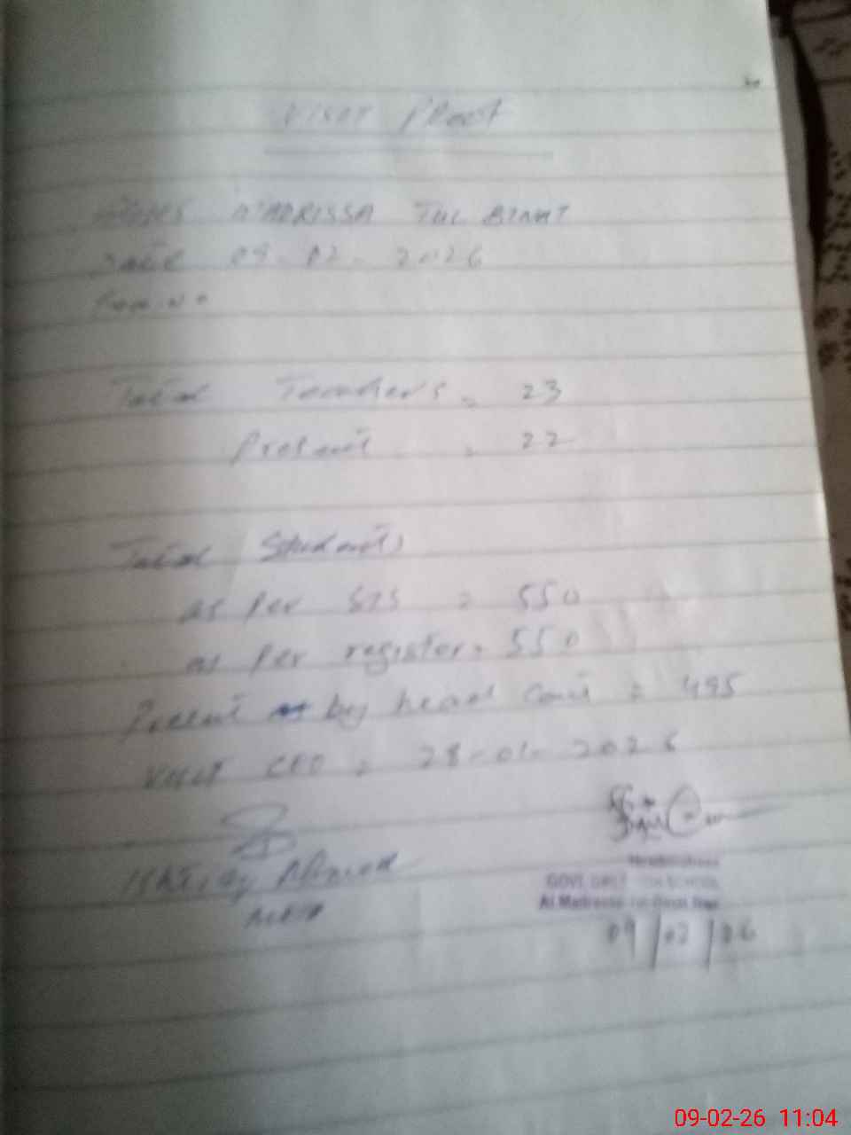 | Attendance Register | Head Teacher | MEA with School | Visit Proof |
