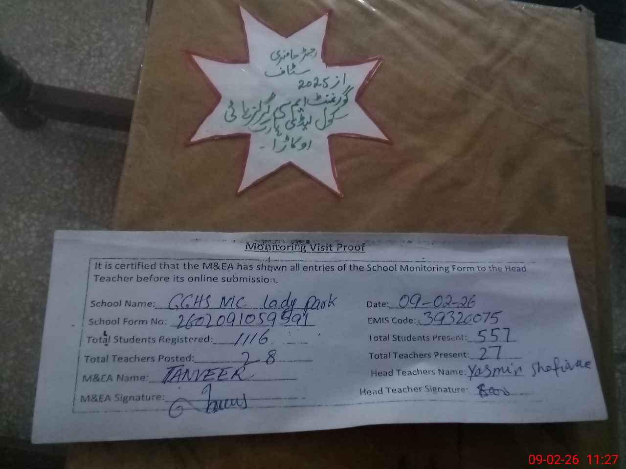 | EMIS Code: 39320075 | Name of School: GGHS MC LADY PARK OKARA | |||