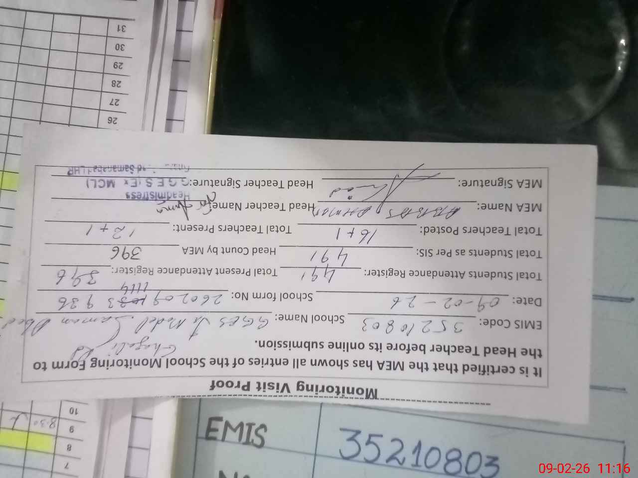 | Attendance Register | Head Teacher | MEA with School | Visit Proof |