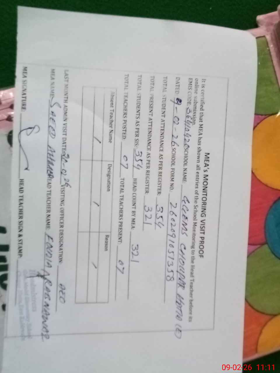| Attendance Register | Head Teacher | MEA with School | Visit Proof |