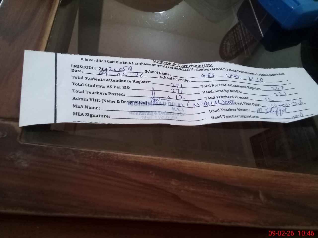 | Monitoring Date: 09-02-2026 | Start Time: 09-02-2026 10:09 AM | End Time: 09-02-2026 10:46 AM | Name of MEA: MU**** BI**** | |