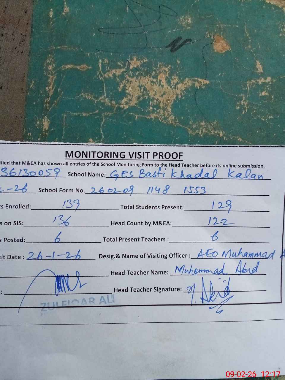 | EMIS Code: 36130059 | Name of School: GES BASTI KHADAL KALAN MULTAN | |||
