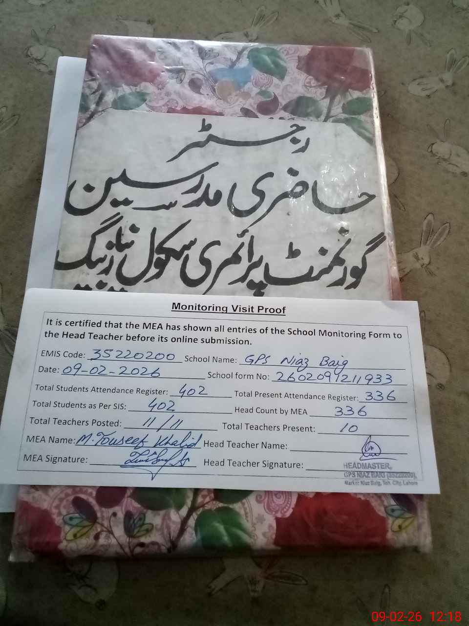 | Attendance Register | Head Teacher | MEA with School | Visit Proof |