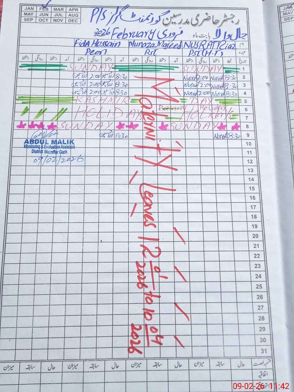 | CNIC | Full Name | Designation | R/C | Absence During Last Calender Month |