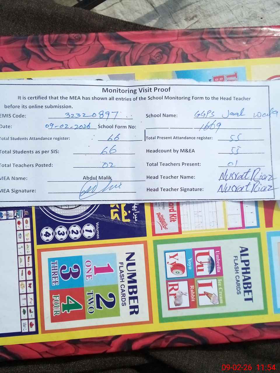 | Attendance Register | Head Teacher | MEA with School | Visit Proof |