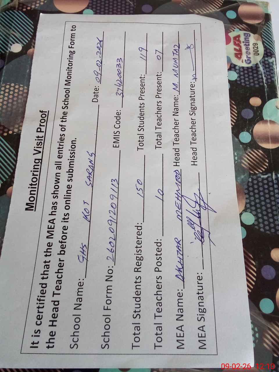 | Attendance Register | Head Teacher | MEA with School | Visit Proof |