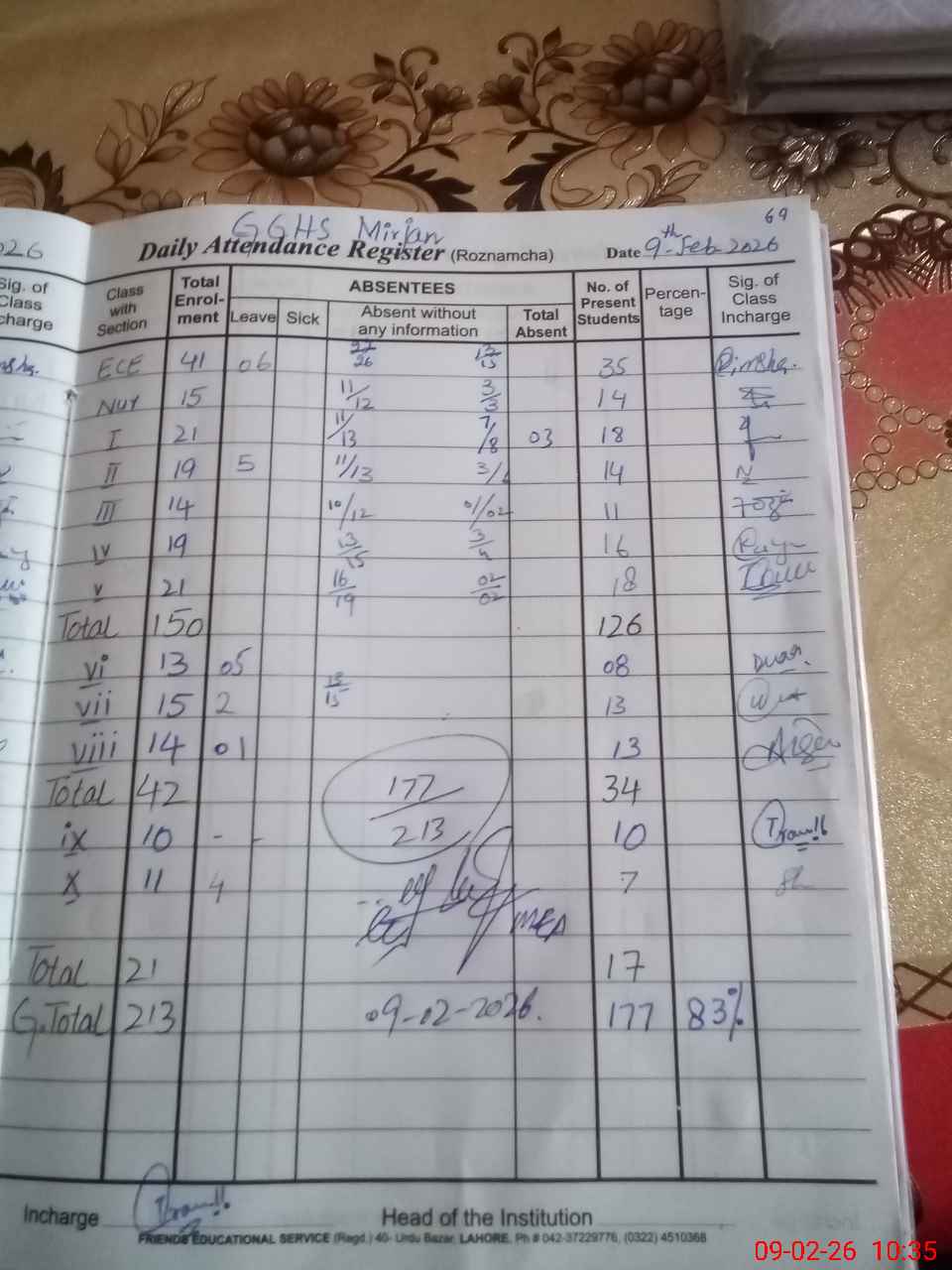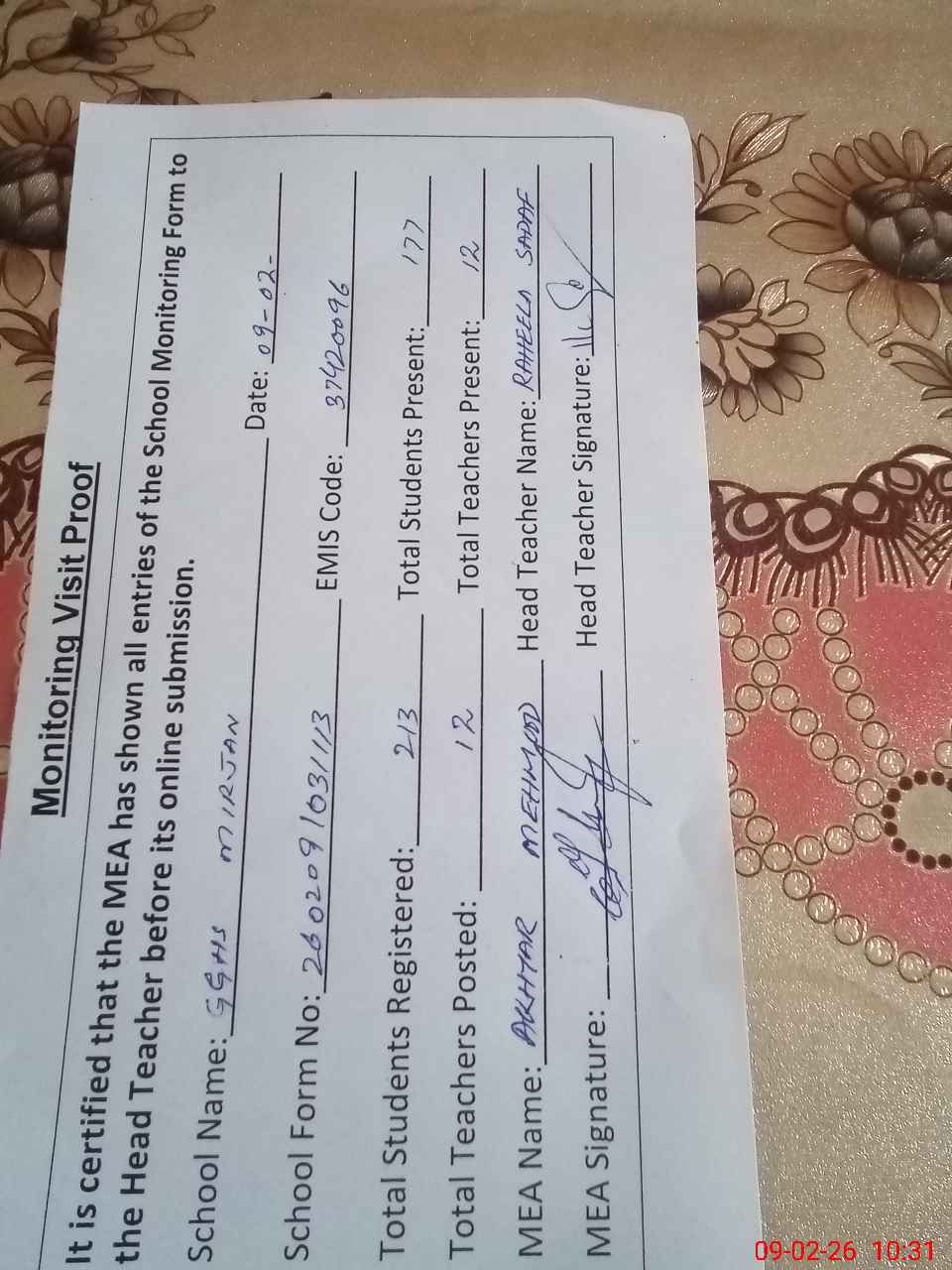 | Attendance Register | Head Teacher | MEA with School | Visit Proof |