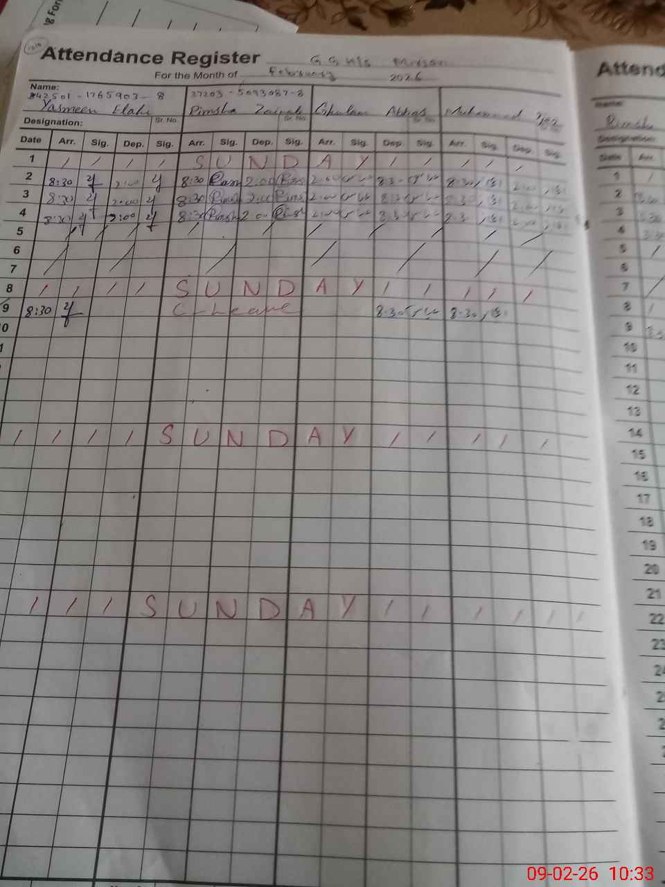 | CNIC | Full Name | Designation | R/C | Absence During Last Calender Month |